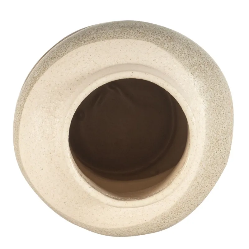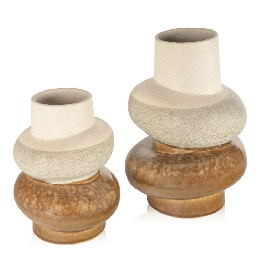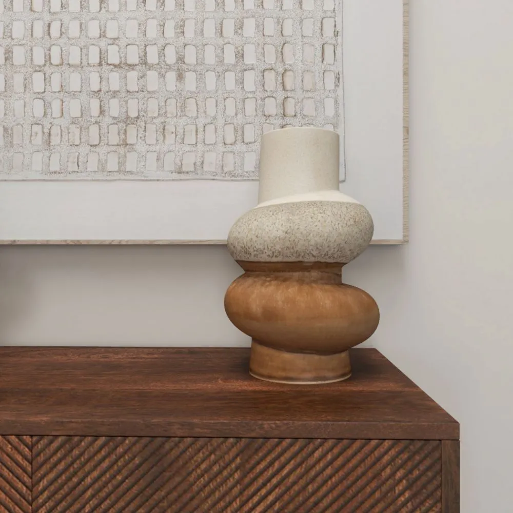 The Molokai table top ceramic vase showcases a distinctive and artistic design, available in two sizes. It features a multi-tiered structure with each section having its own unique texture and color. The top section is a creamy beige with a smooth finish, providing a soft and elegant look. The middle section has a speckled grey texture, adding a tactile and visual contrast. The lower sections display a rich glossy brown hues, giving the vase an earthy and organic feel. This combination of shapes, colors, and textures makes the Molokai vase a versatile and eye-catching piece for various interior styles.
