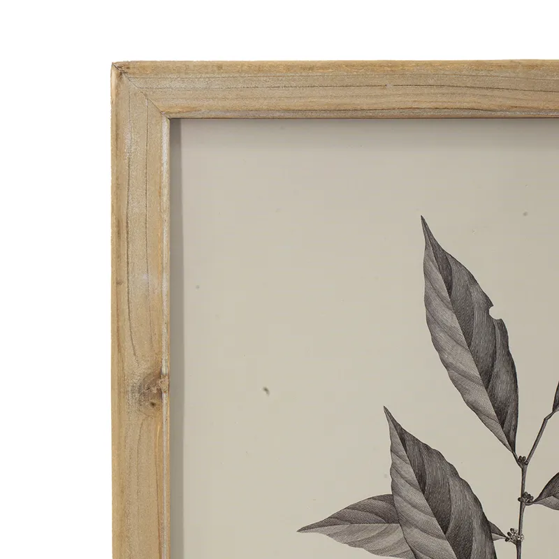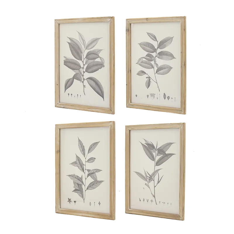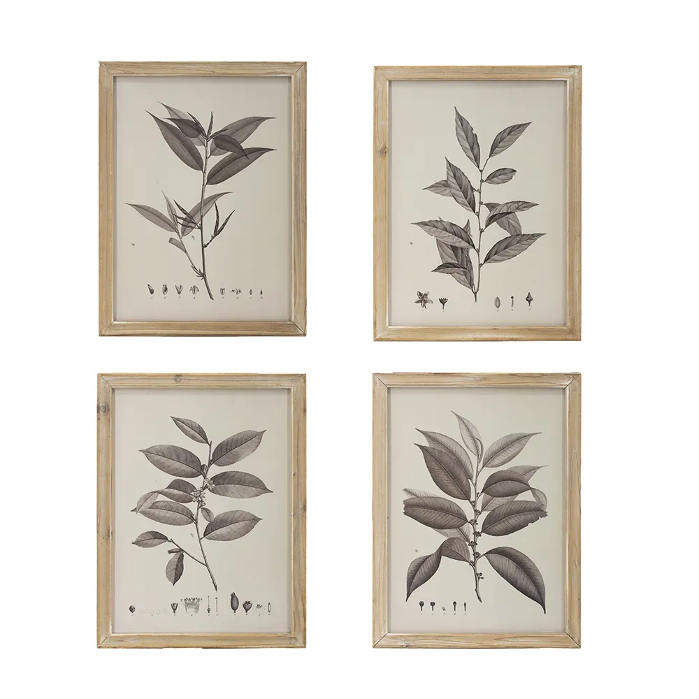 Add a touch of nature with the Aba set of 4 wall decor. These beautiful prints detail four different leaf types and their seeds. Framed with natural wood that is lightly distressed.