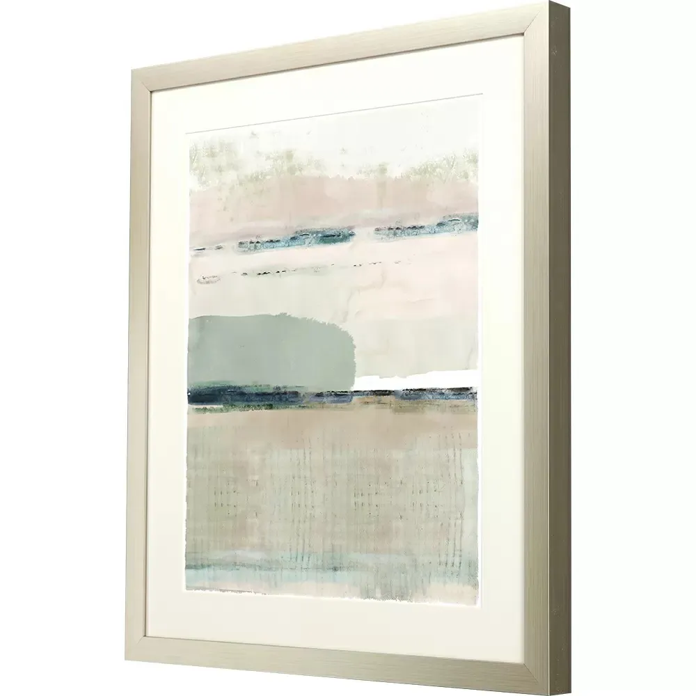 Shades of green and beige converge. Framed in a modern shadow box style molding in a silver finish.