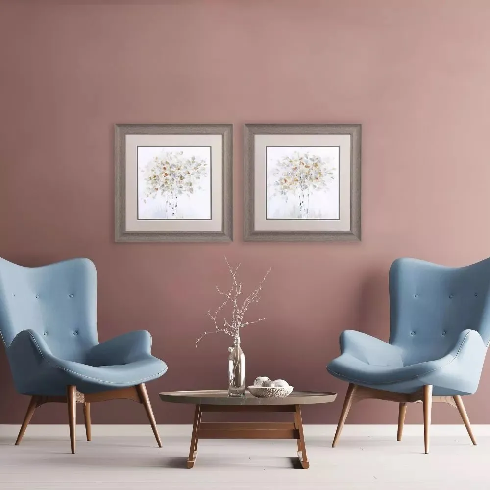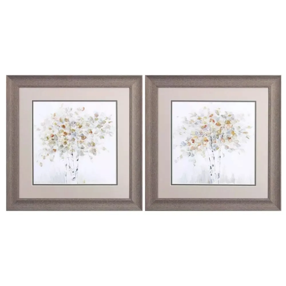 A set of two birch tree landscape images that are double matted, framed under glass and paired with a wood tone frame.