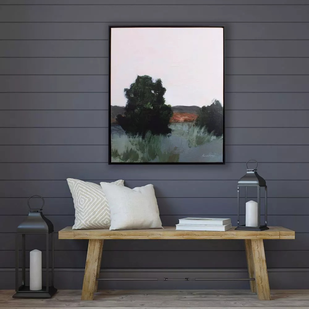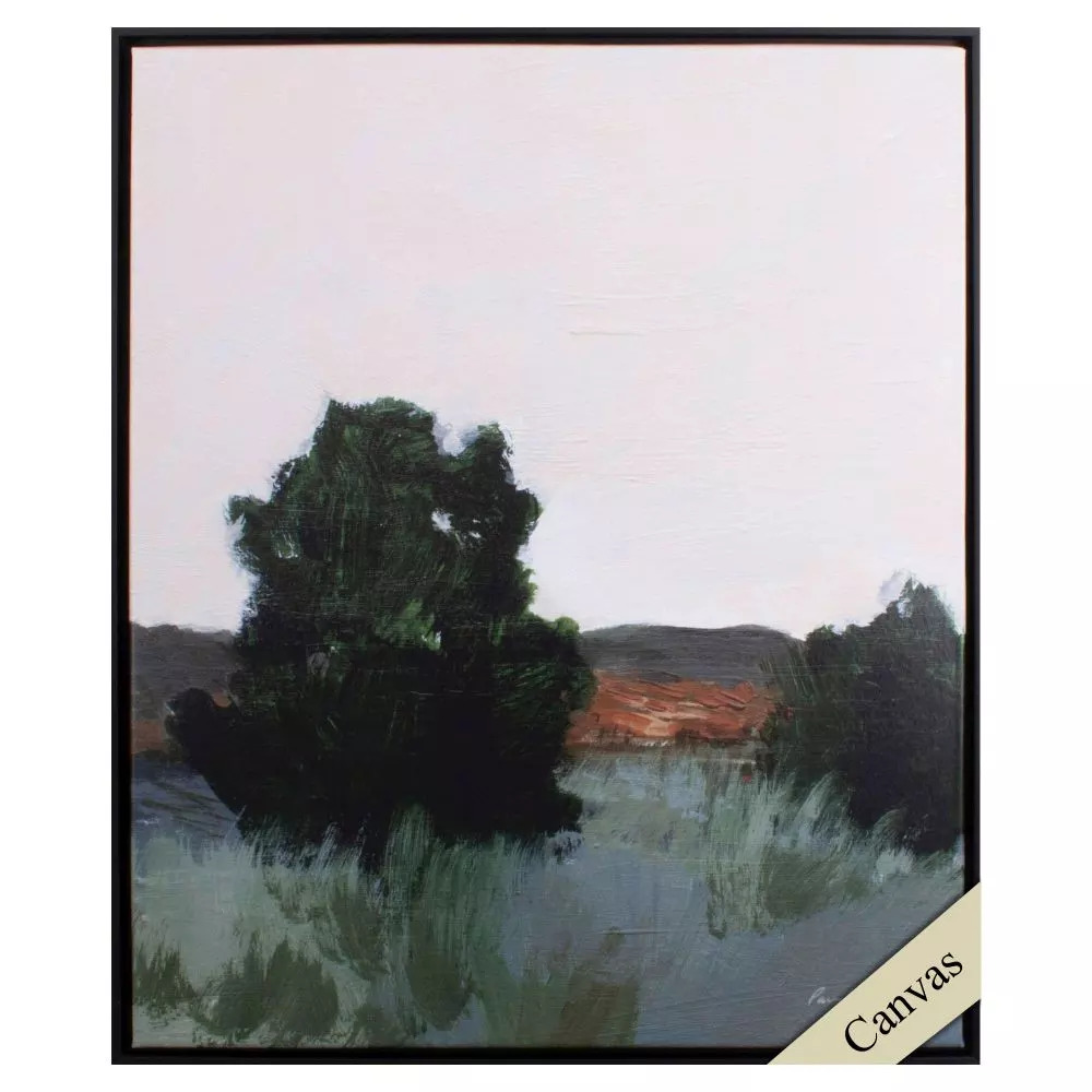 A landscape canvas that is wrapped with a solid wood stretcher bar and finished with a matte black frame.