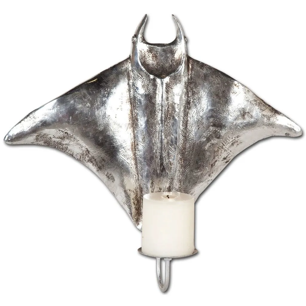 The Banha elegant wall candle holder features a pewter polished metal finish and takes the shape of a string ray.