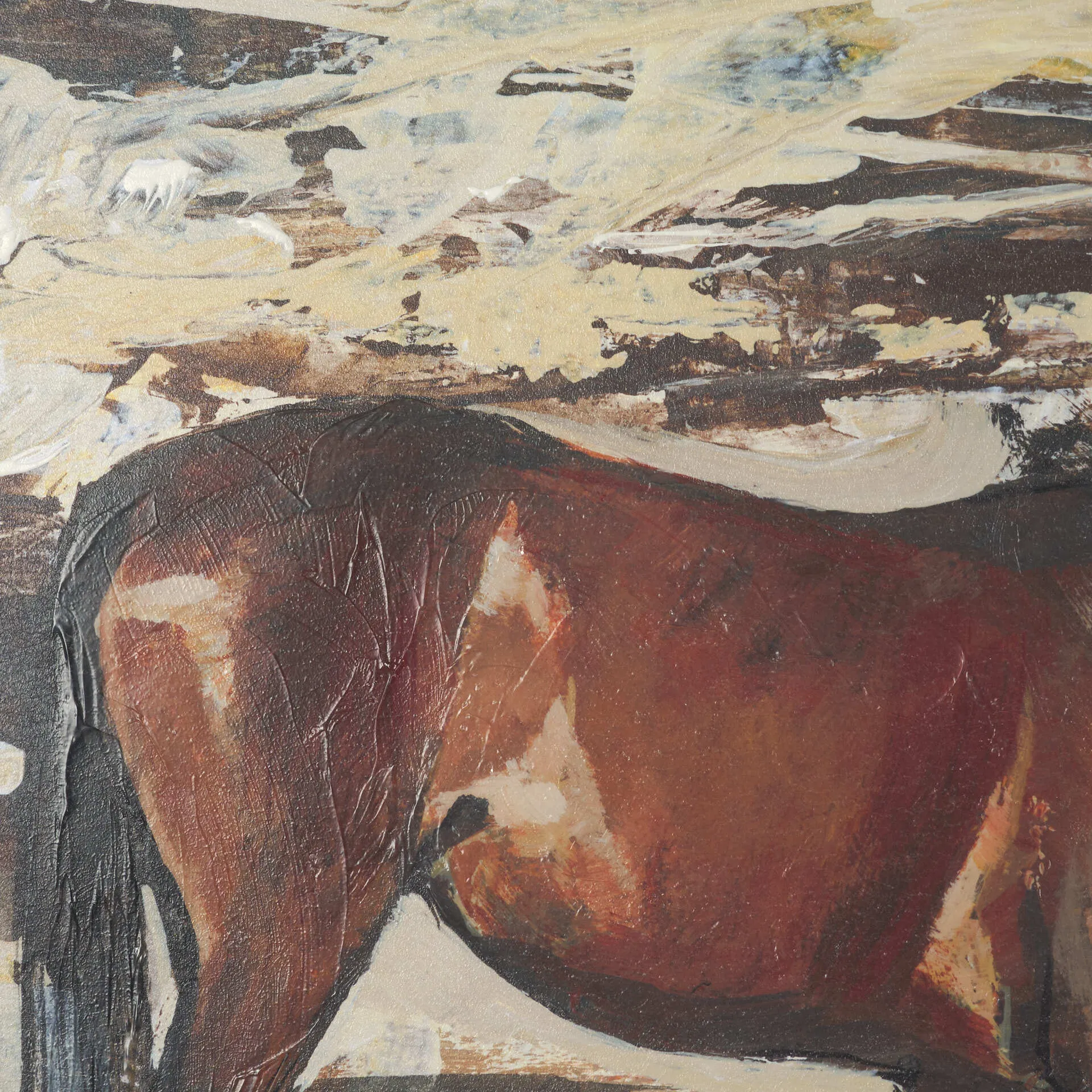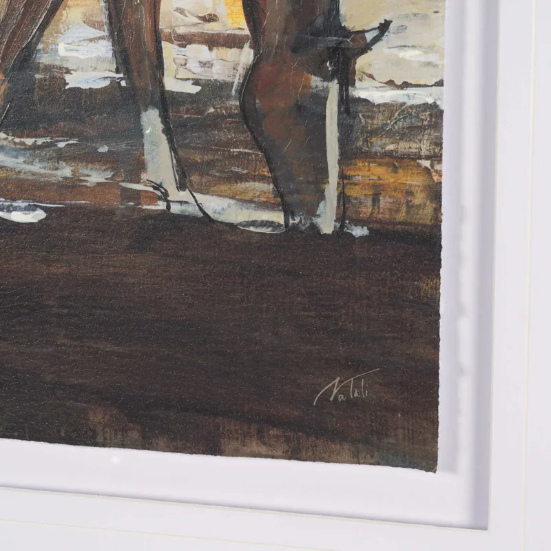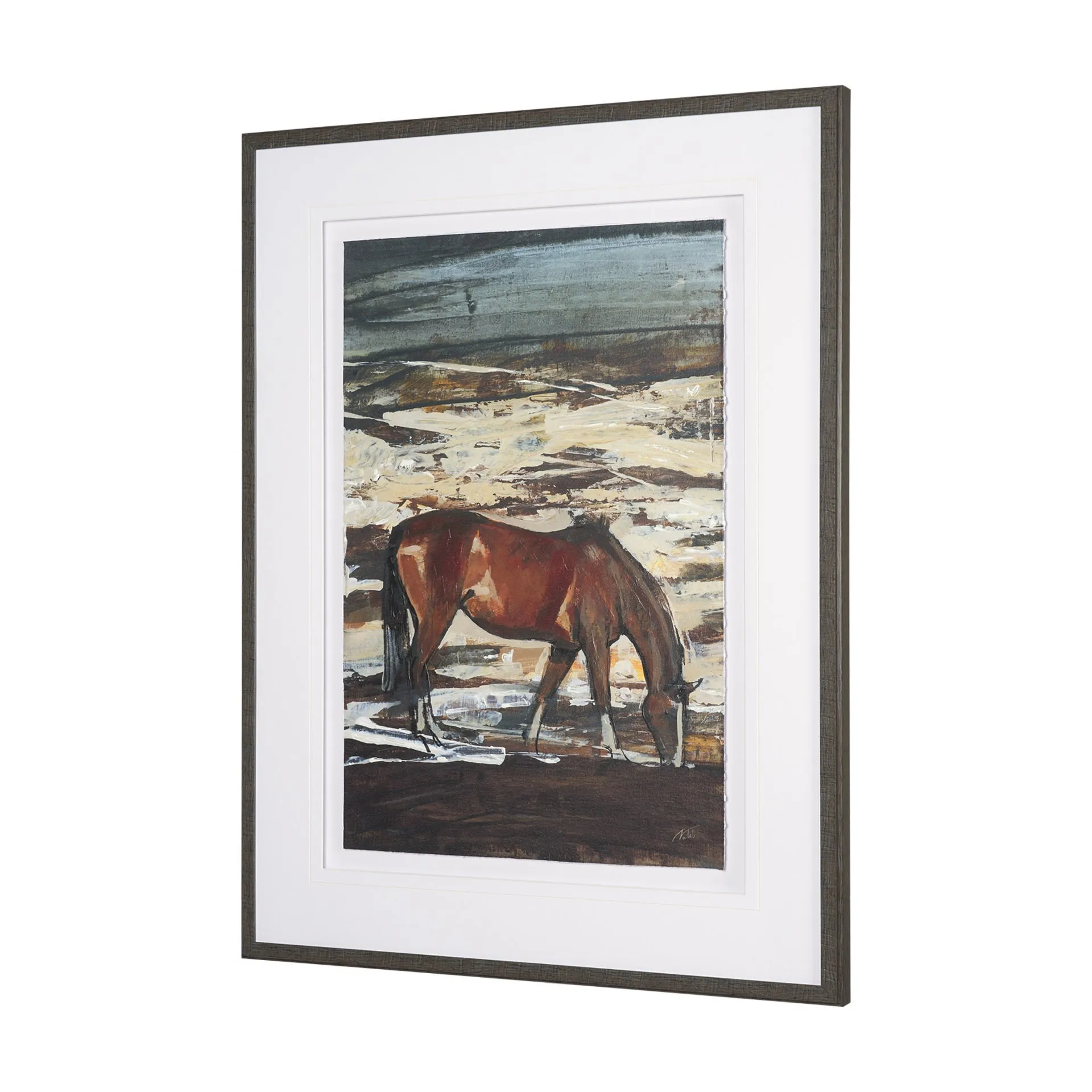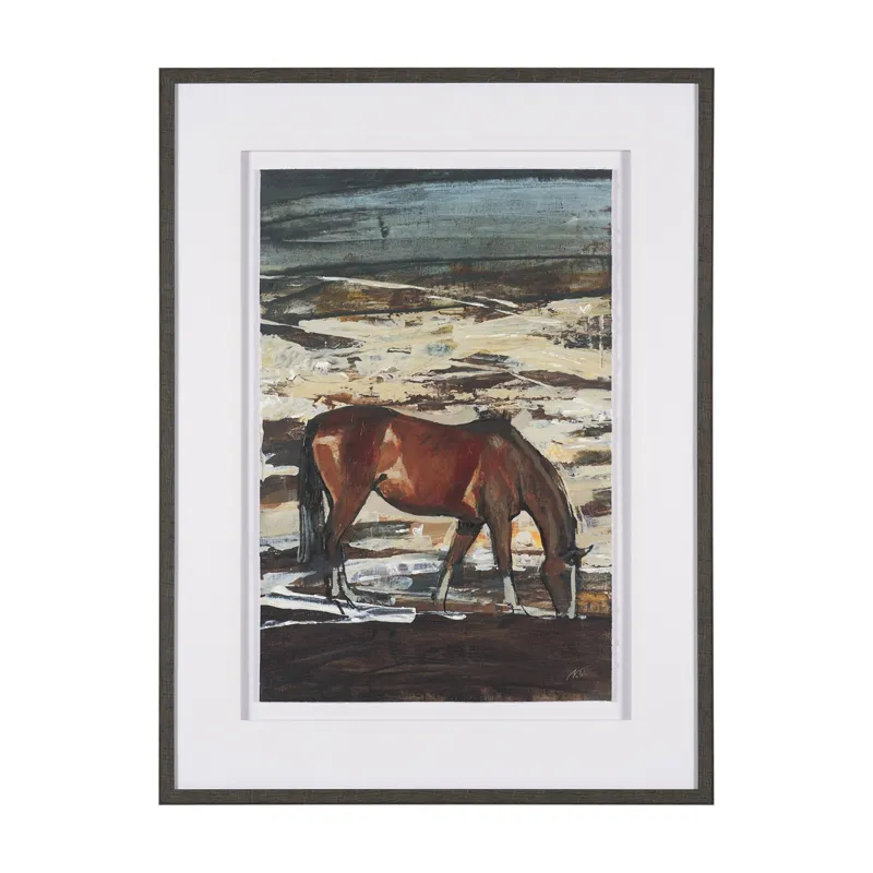 "Equine Echoes I" by Mercana Studio is a captivating depiction of a solitary horse gracefully grazing against a textured backdrop of earthy tones and ethereal blues. This hand-embellished artwork is beautifully matted under glass, allowing its rich, layered colors and dynamic textures to shine with sophistication. Framed in a sleek, dark wood style, it effortlessly combines rustic charm with contemporary elegance, making it a timeless statement piece for any space.