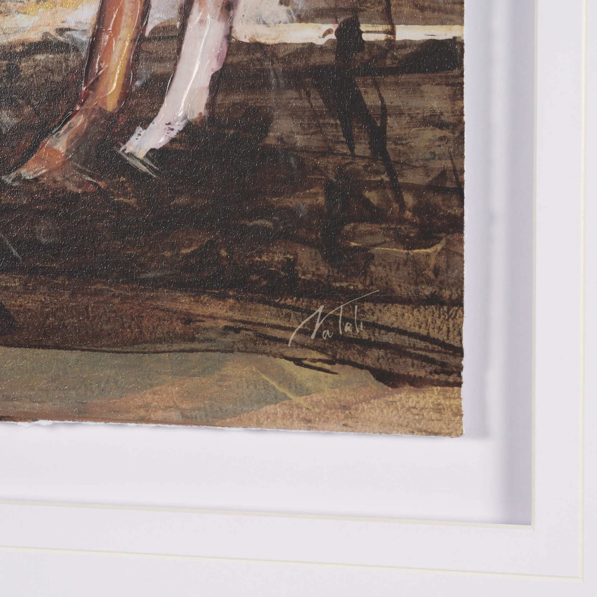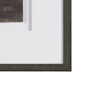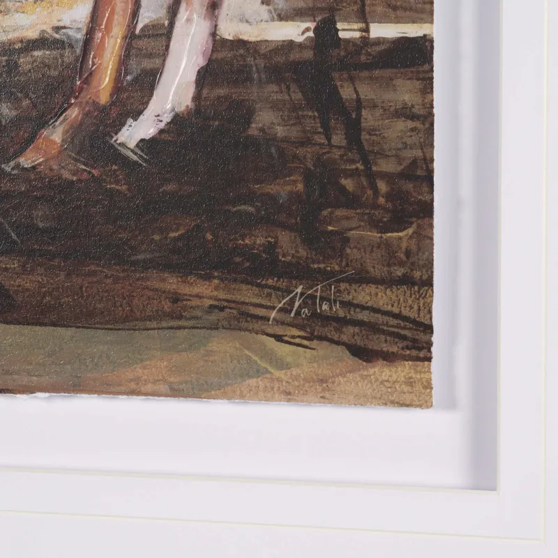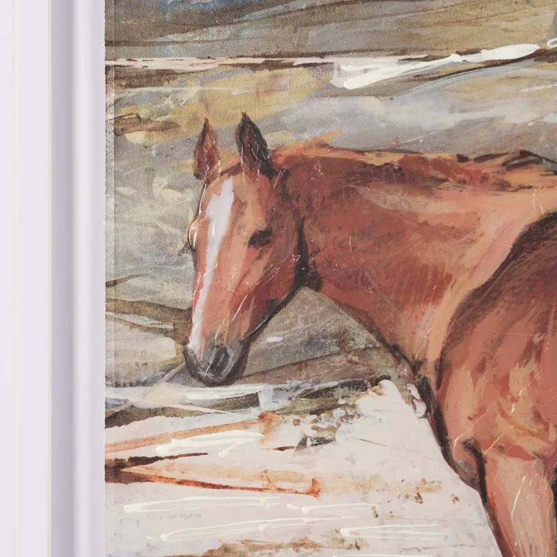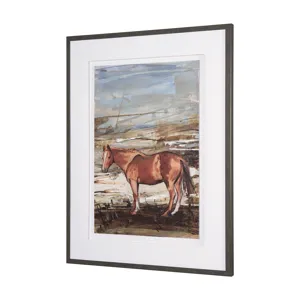 "Equine Echoes II" by Mercana Studio is a captivating hand-embellished artwork that depicts a lone horse in a sweeping, rustic landscape. The piece employs rich earth tones—deep browns and subtle sienna—set against a serene backdrop of sky blues and muted whites, evoking a sense of freedom and tranquility. Expertly matted under glass, the textured details of the piece are highlighted by an elegant dark wood frame, adding a sophisticated touch that complements its natural inspiration.