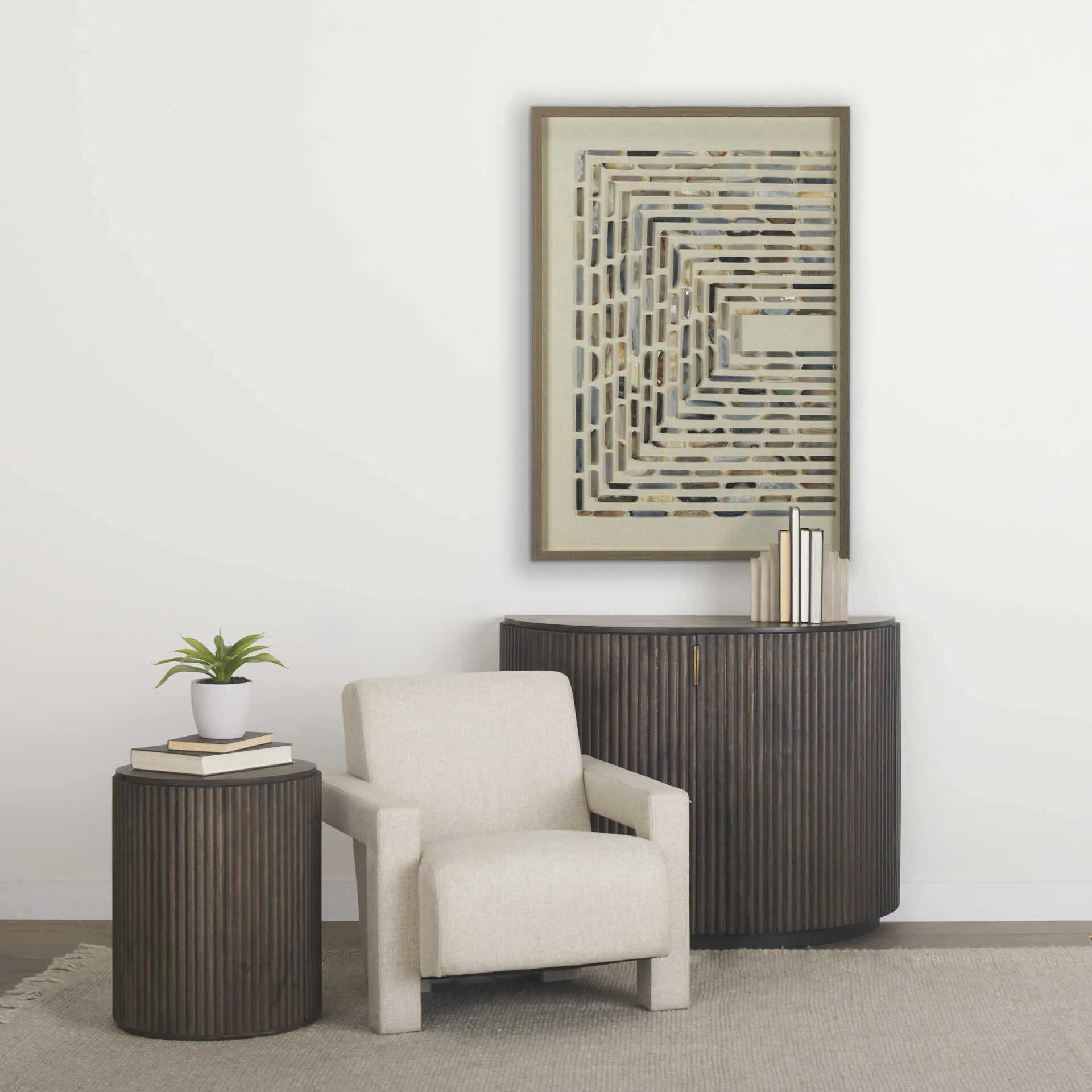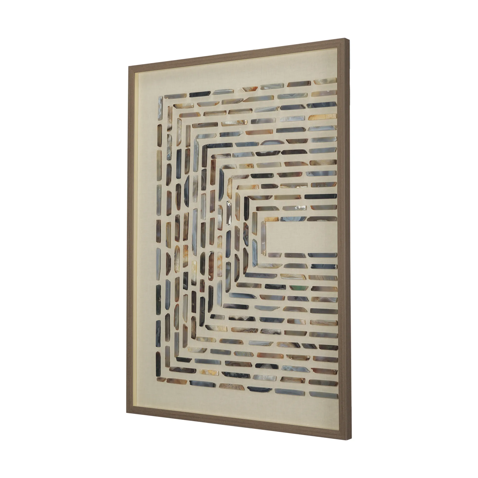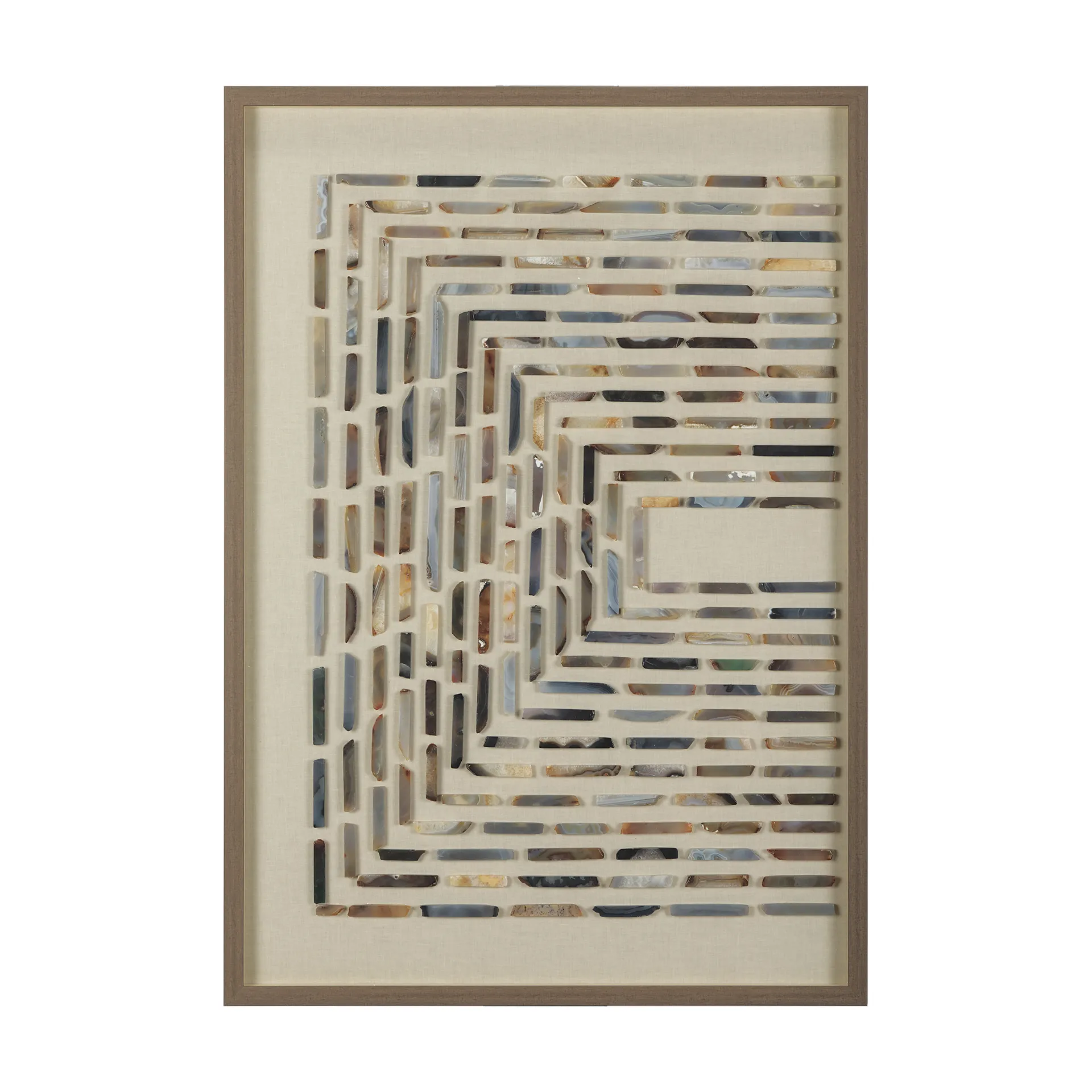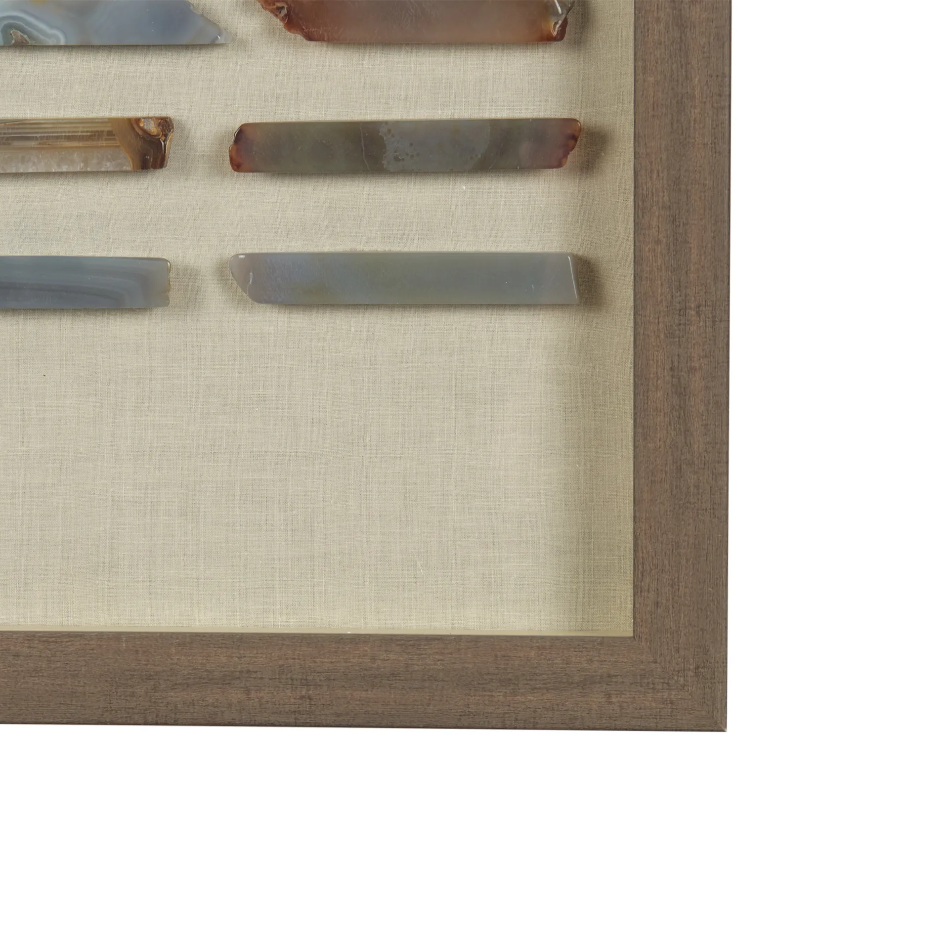 Wood-framed wall art featuring agate stones, perfectly placed to create a series of dashed lines in rectangular "c" formations.