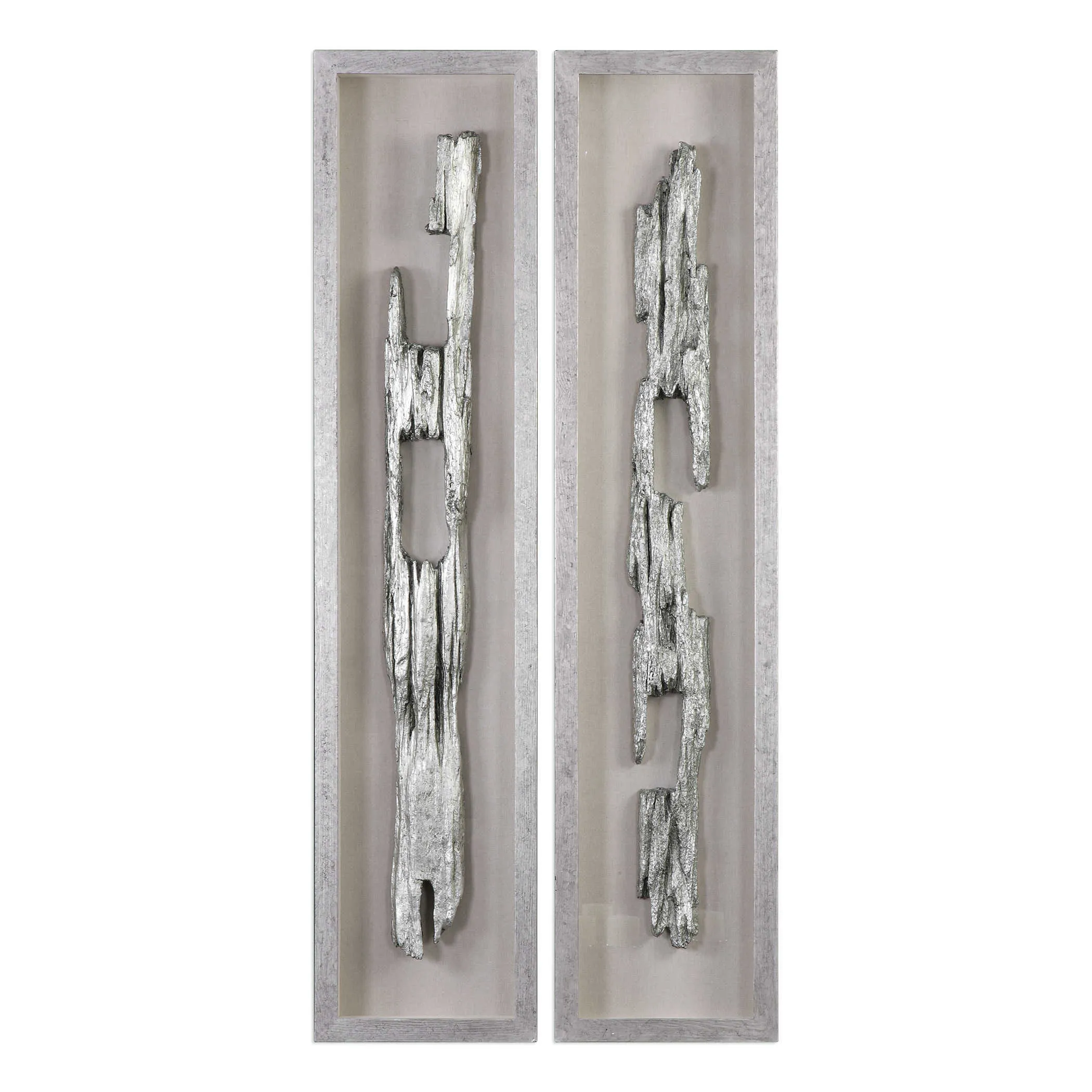 Replicated from old fence posts, finished in bright metallic silver, placed on a linen backing with a hand applied silver leaf framed shadow box.