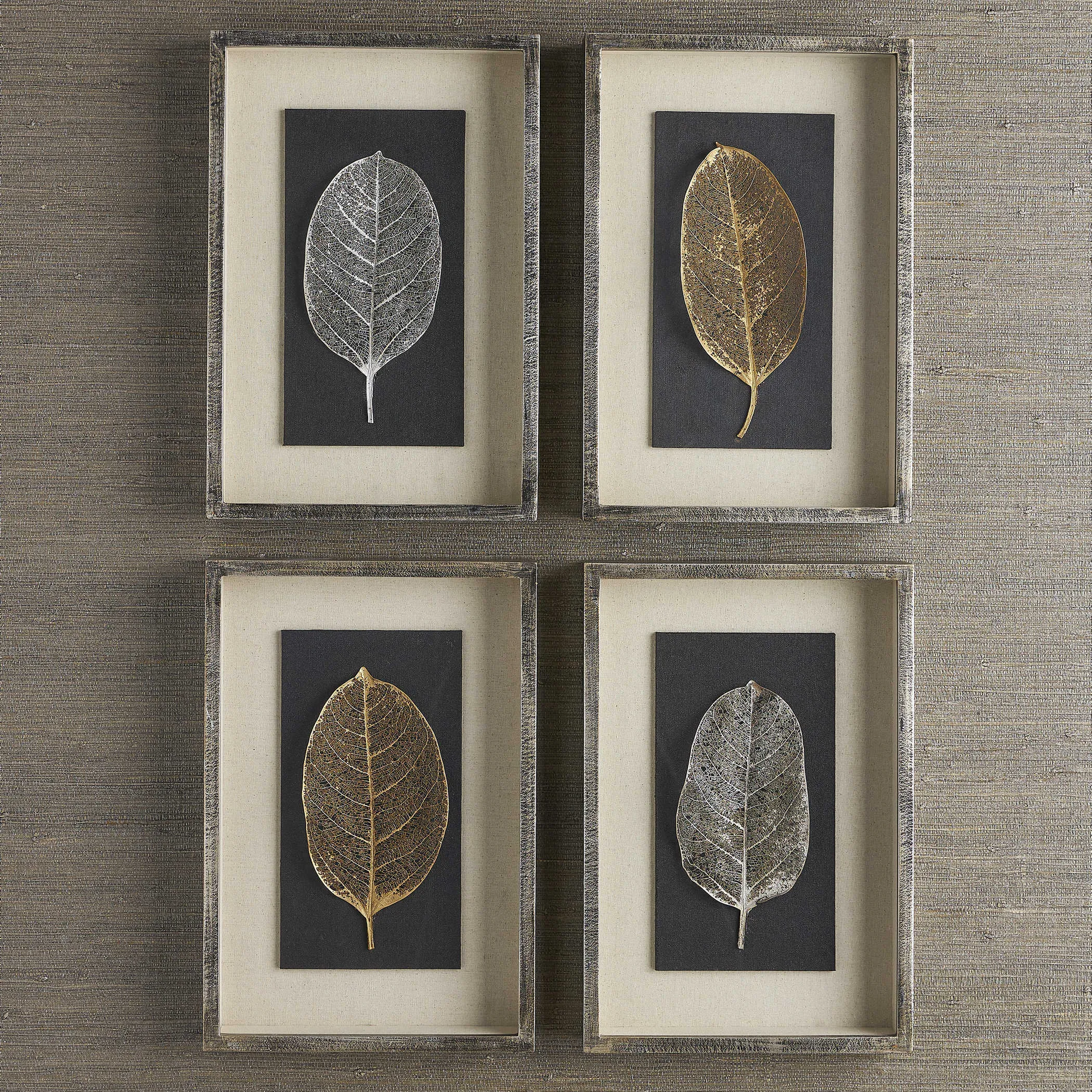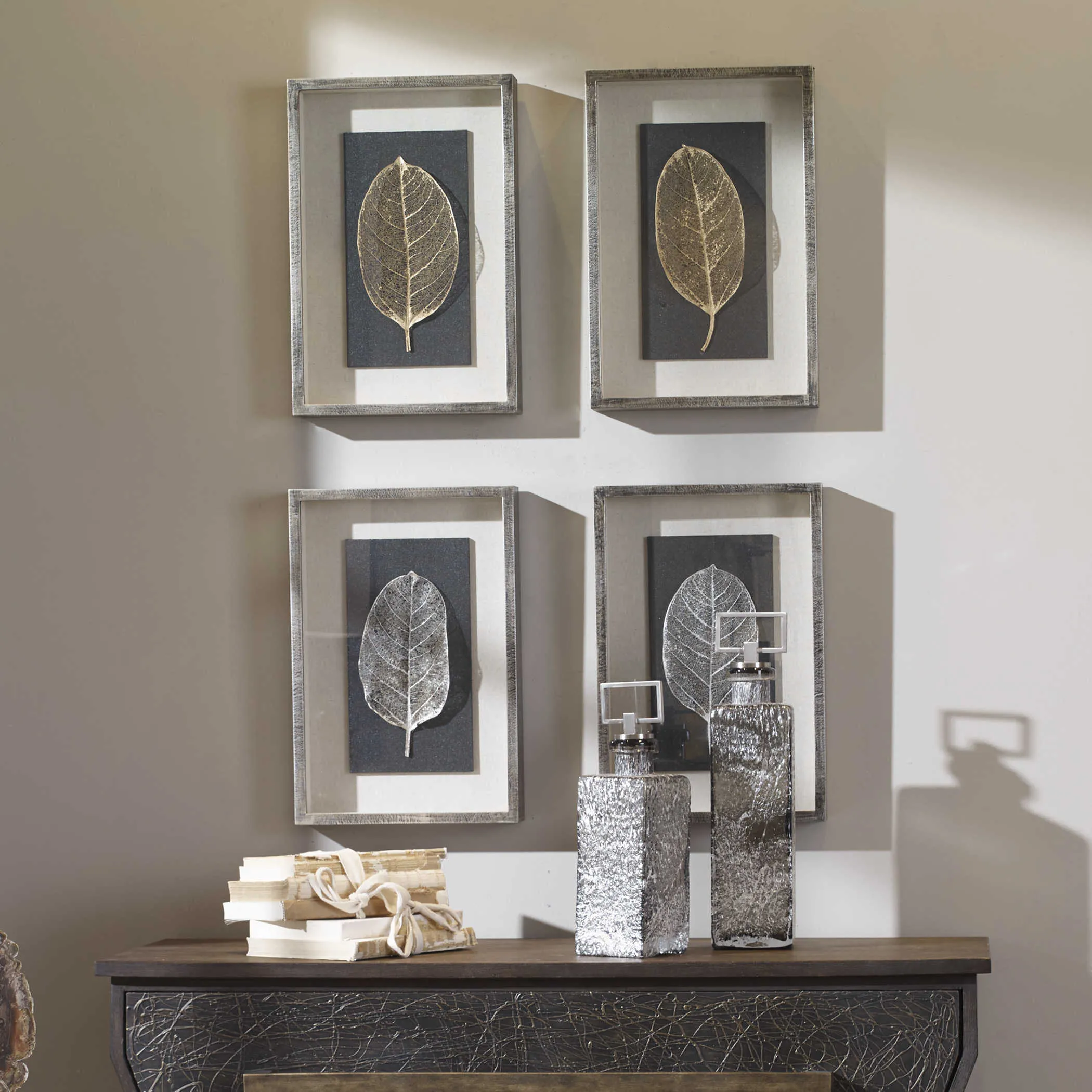 Preserved leaves finished in elegant gold and silver leaf, mounted on a black linen backing, with an oatmeal linen interior liner. Shadow boxes are framed in a heavily burnished silver leaf.