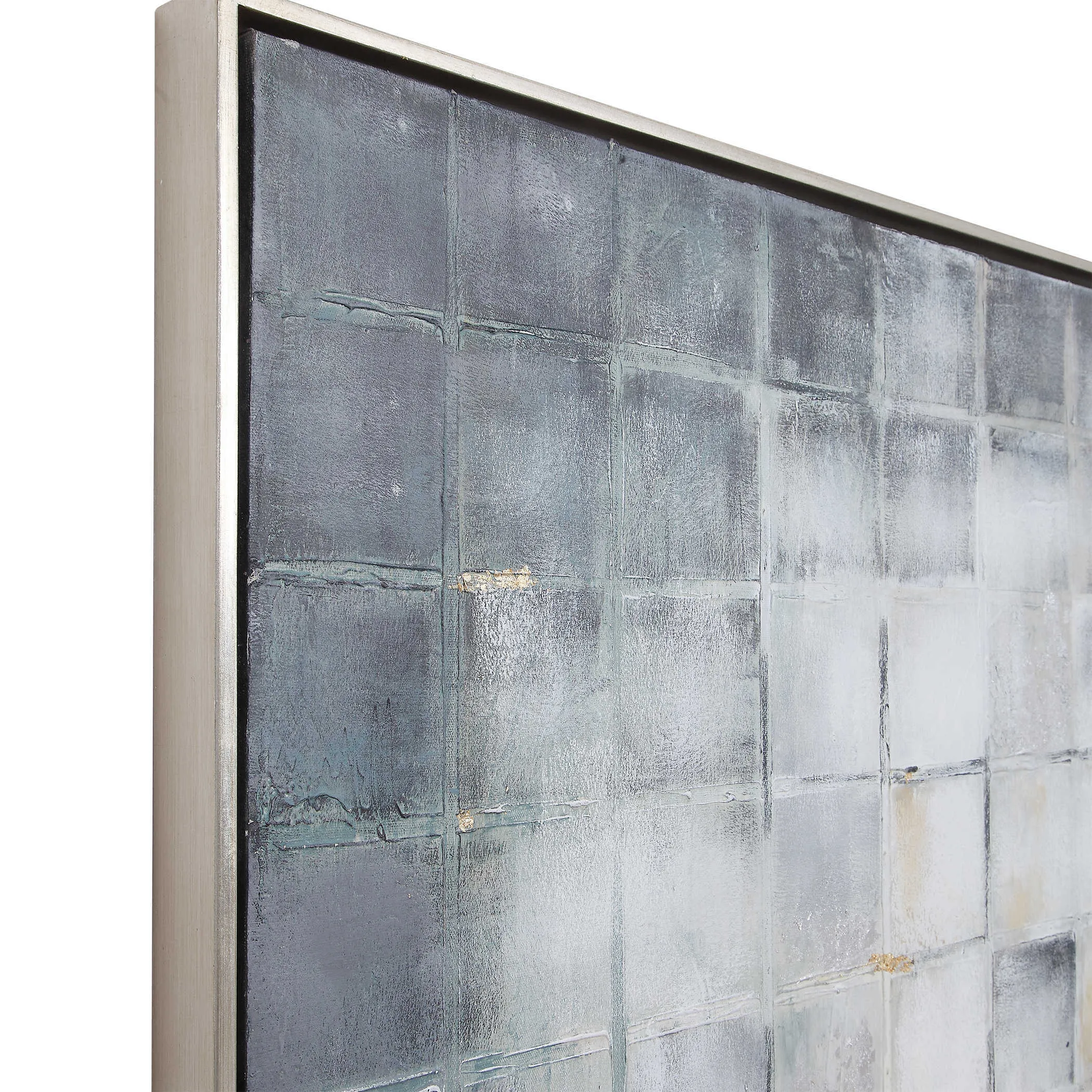 Hand painted on canvas, this urban-inspired, geometric pattern brings a modern style to a design. Lightly textured cool blue, gray, and silver hues are accented by subtle, gold leaf accents. A silver leaf gallery frame surrounds the artwork. Due to the handcrafted nature of this artwork, each piece may have subtle differences. This piece may be hung horizontal or vertical.