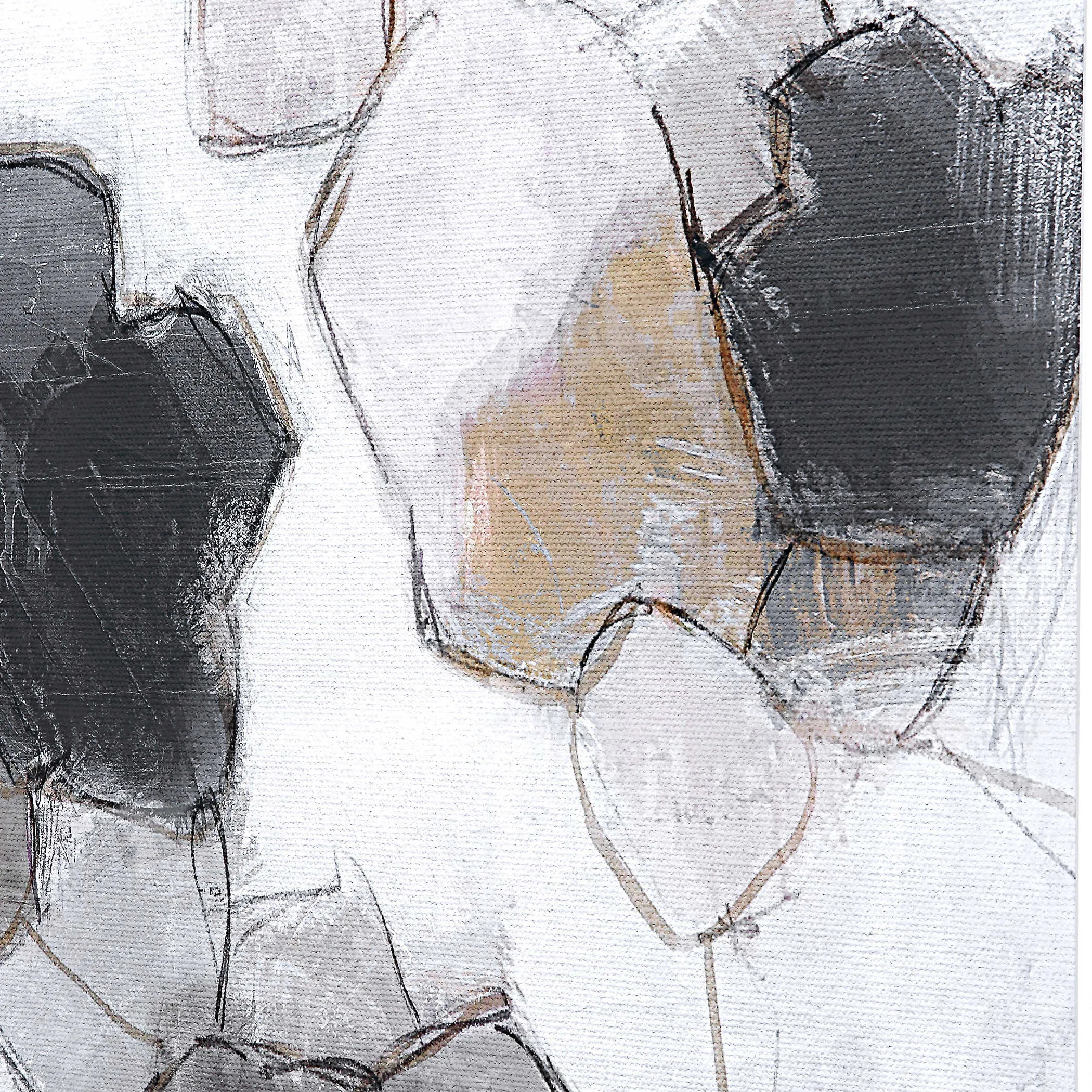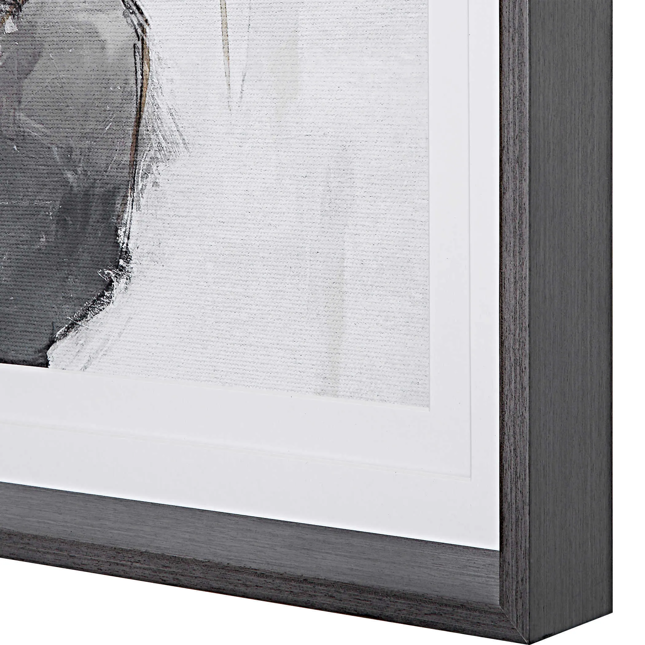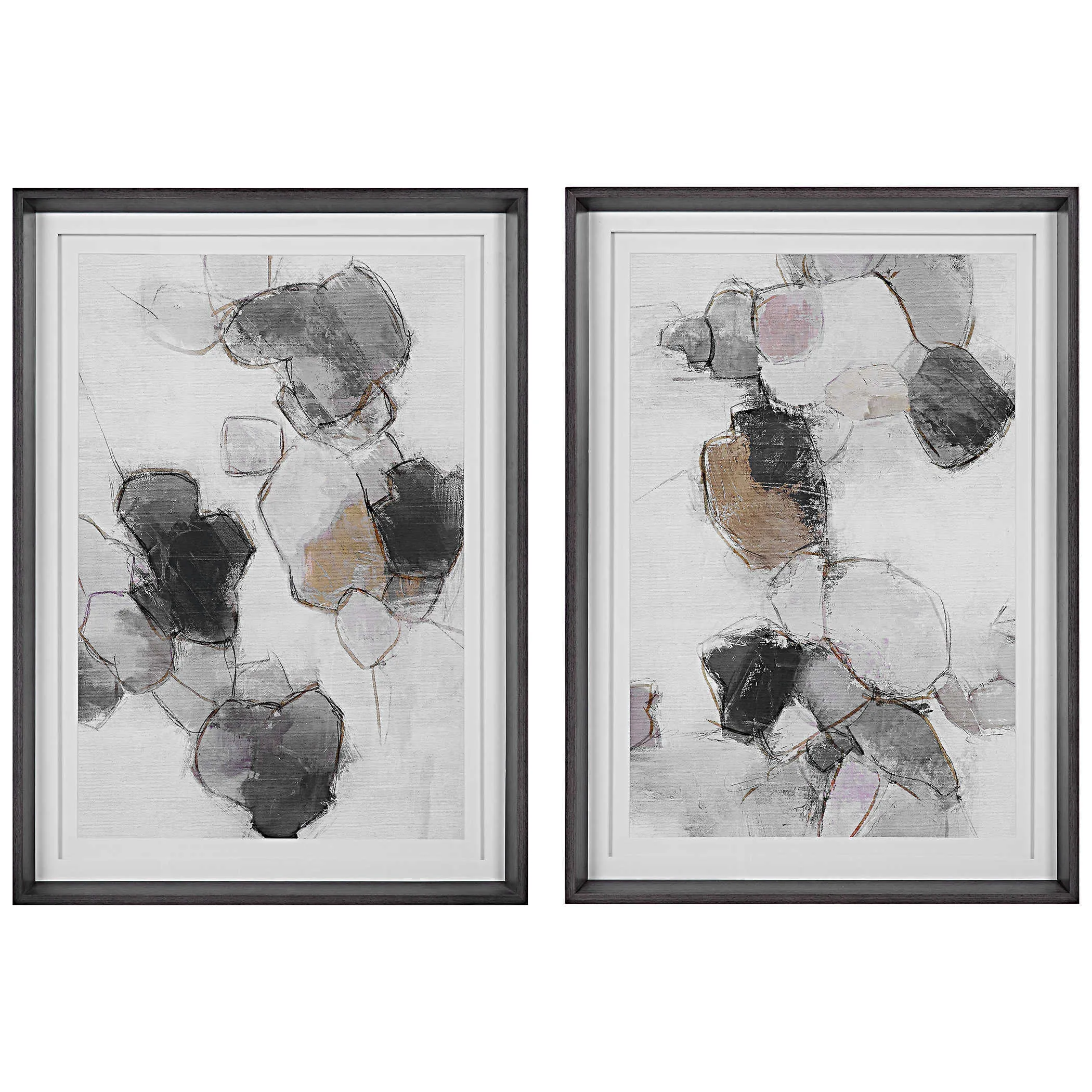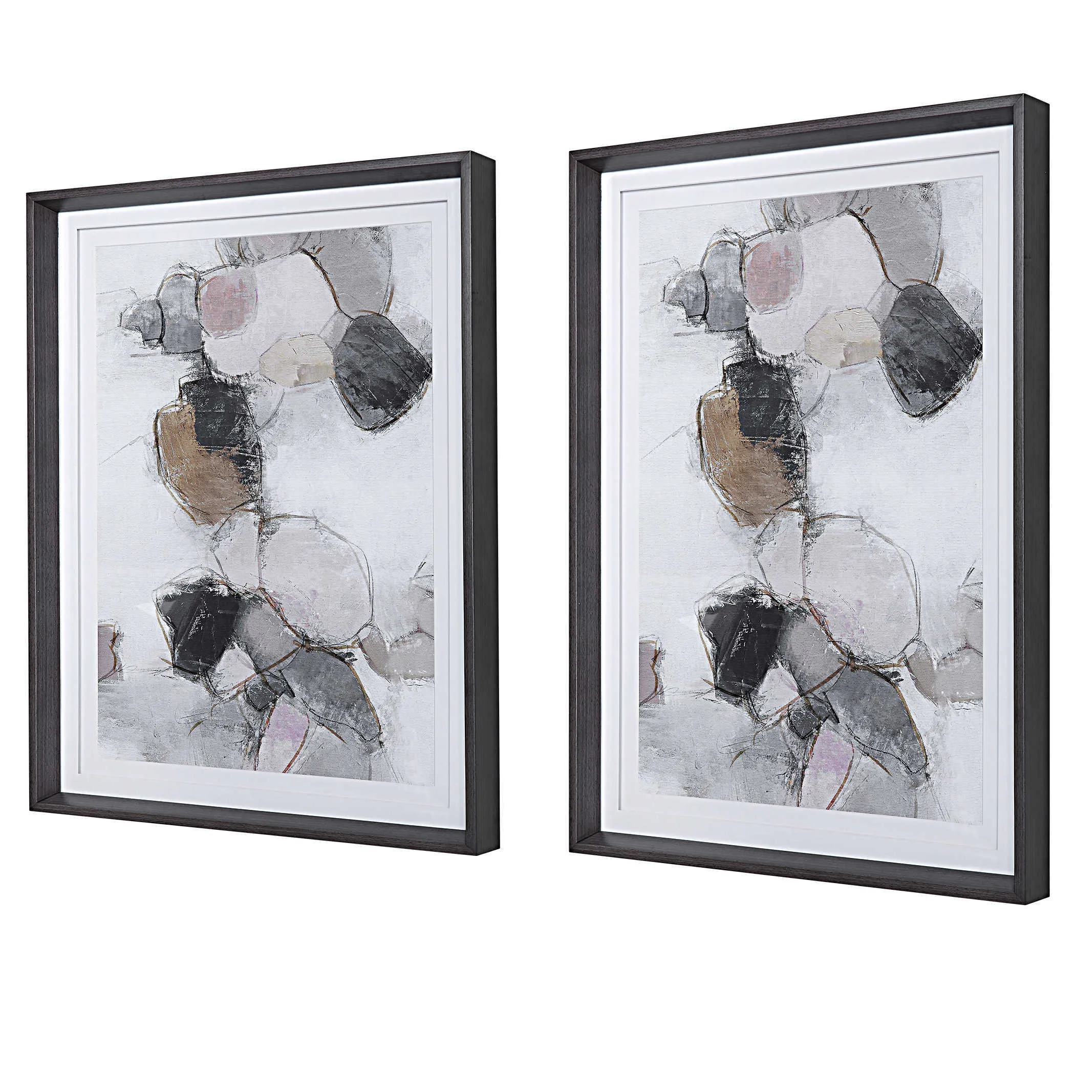 The Plunging Pastels artwork exhibits bold shades of charcoal and white with soft blush and mustard tones. Each abstract print is accented by double white matting and a soft gray wood frame under glass. Artwork by Paul Duncan.