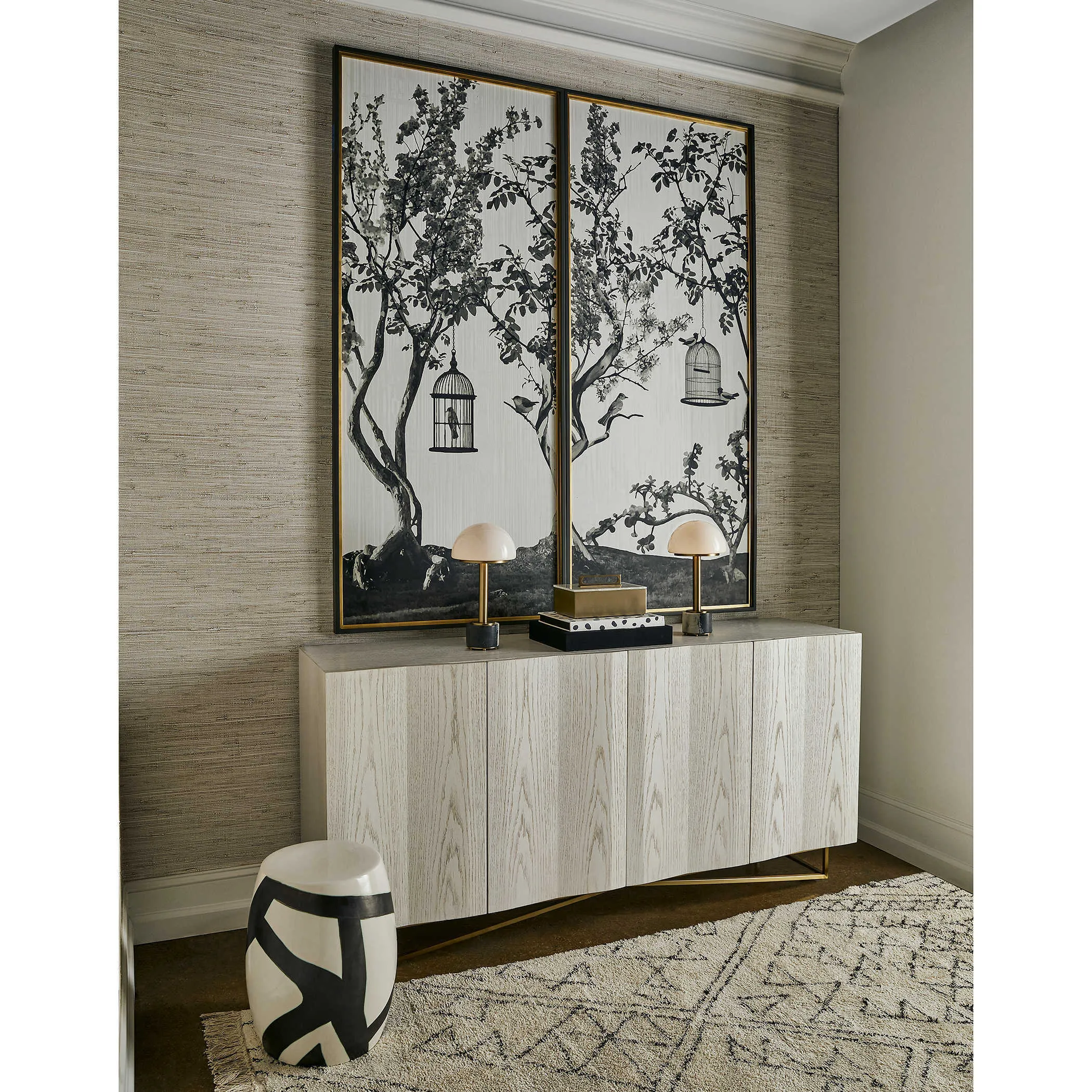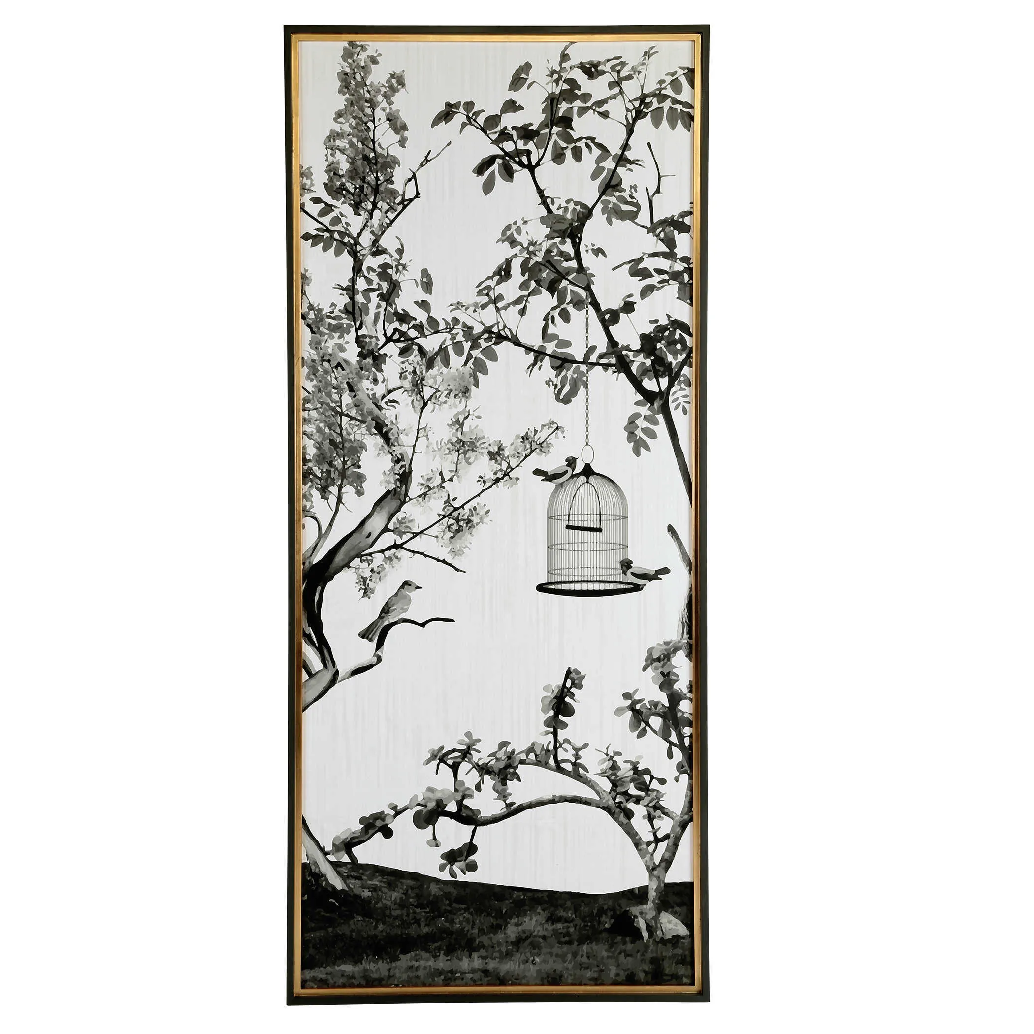 Inspired by vintage hand-screened wallpaper, Woodland Songbird Right captures the peaceful scenes of a whimsical garden in black and white. Printed on paper with special matte finish. Framed in a charcoal gray wooden frame with a metallic gold leaf inner lip. Pair with Woodland Songbird Left for an even more magical experience. Artwork by Amy Shaw.