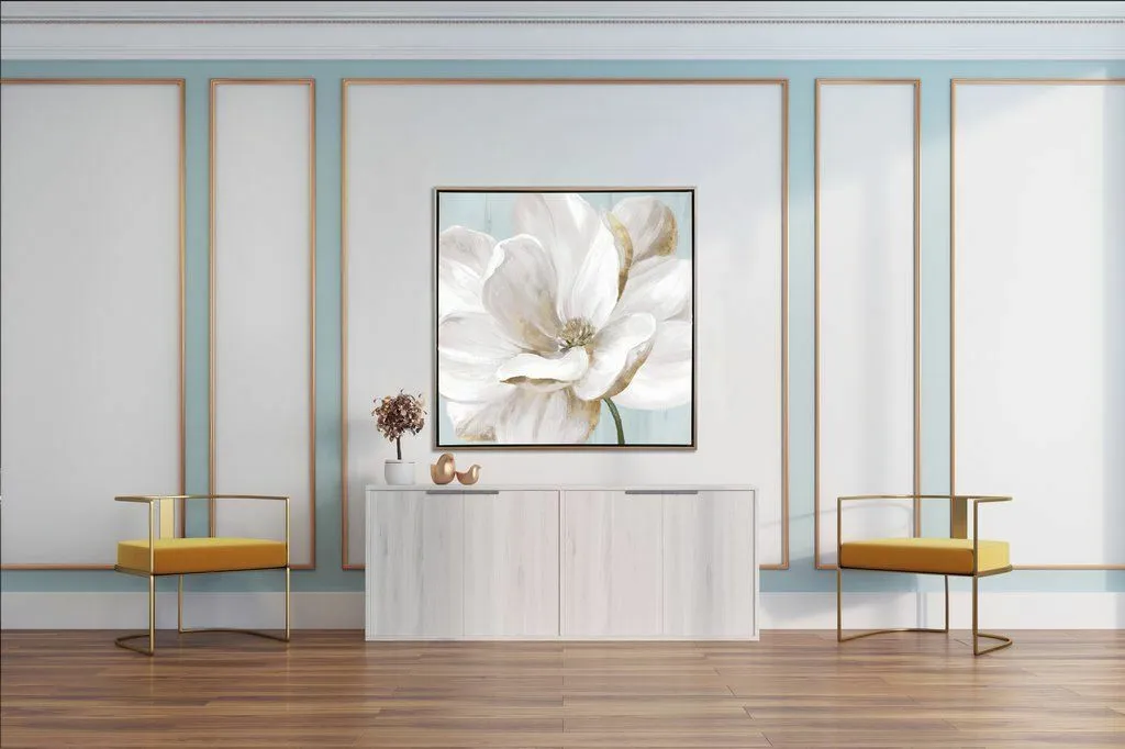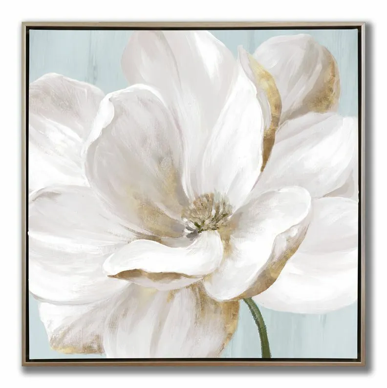 Hand embellished canvas art in a champagne floater frame with gold foil accents