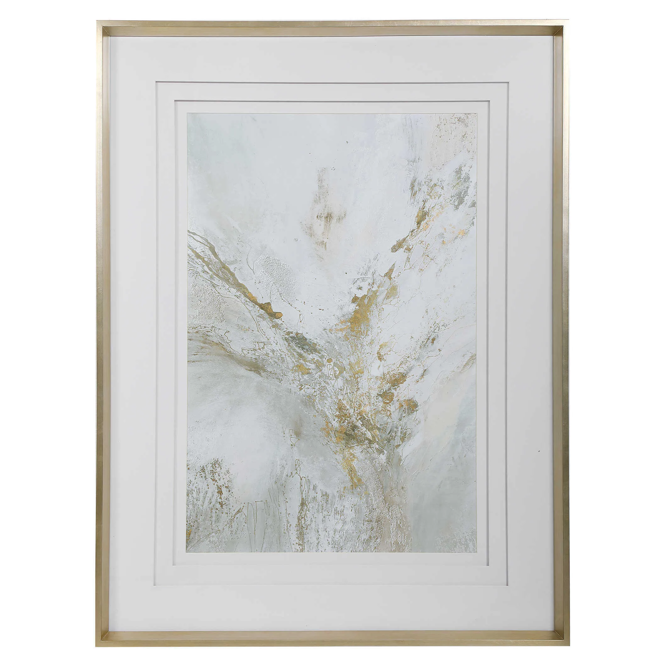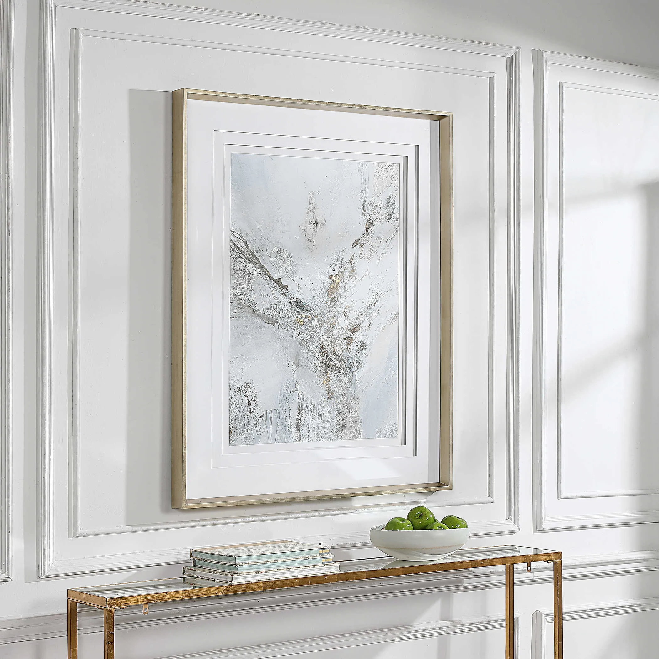 Create an elegant statement with this feminine abstract print. The neutral artwork features shades of light gray, white, and gold leaf. Triple white matting and a warm silver leaf frame complete this sophisticated piece. Print is placed under glass. Artwork by Jennifer Gardner.