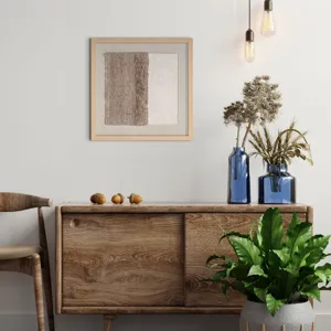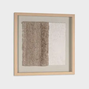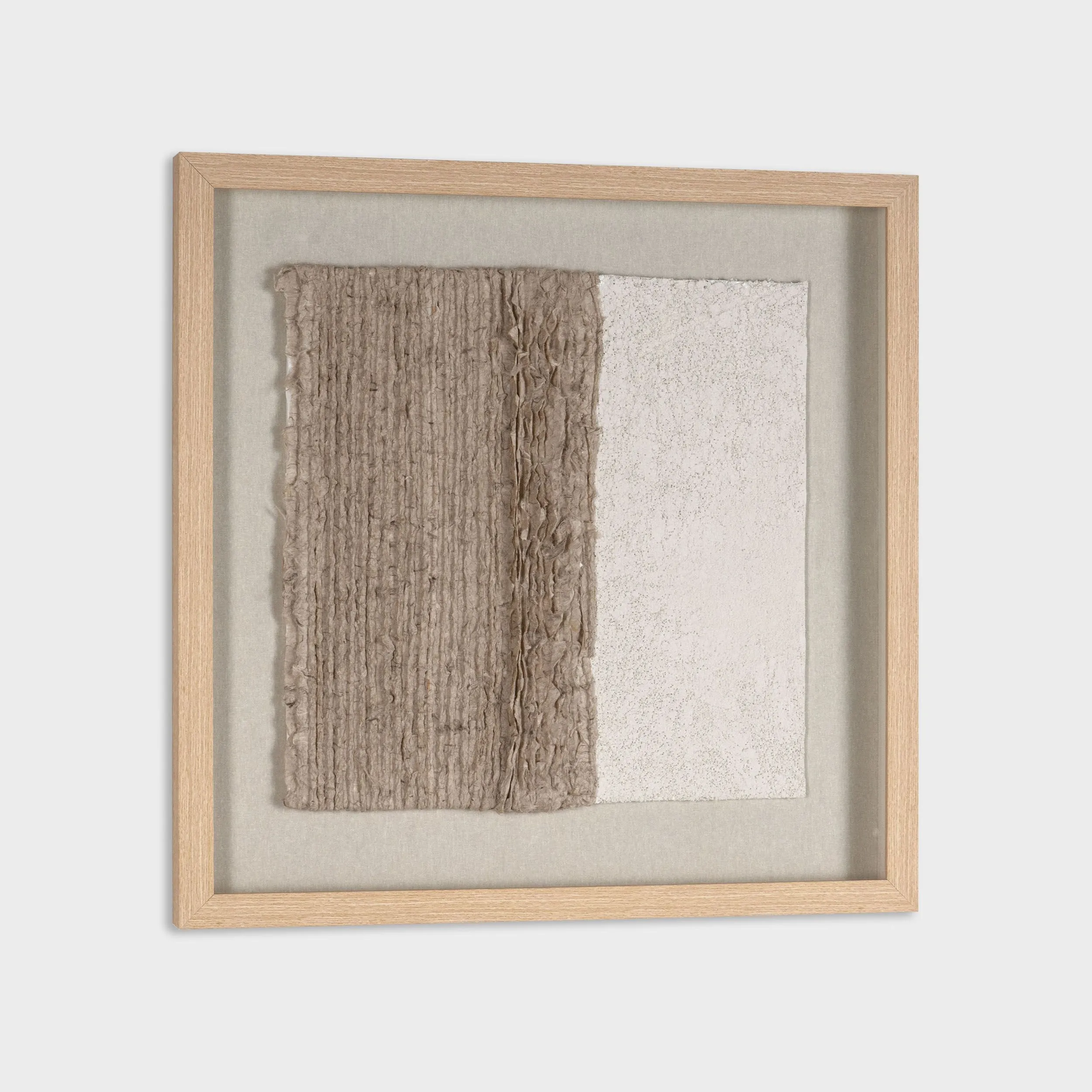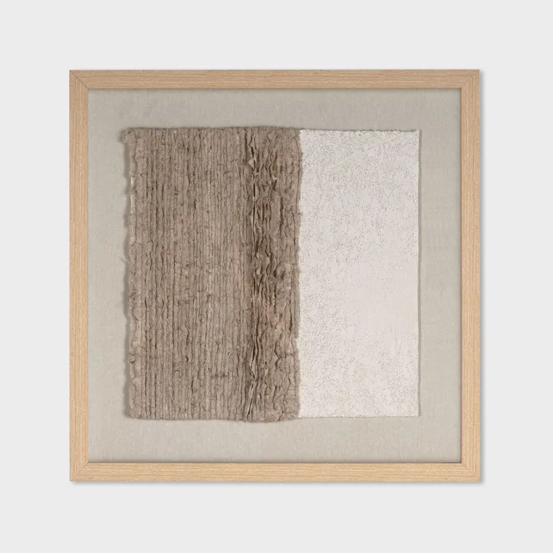 The 24" x 24" shadow box features two contrasting textures side by side within a neutral color palette. Made using hand laid paper pulp, the textures are visually intriguing as it plays with light and shadow, potentially evoking various interpretations or emotions from the viewer. The polycomposite frame radiates a sense of warmth and richness, enveloping the artwork in a subtle elegance, all beautifully showcased behind glass. The piece’s exploration of tactile qualities within a minimalist approach can make a powerful statement in any room setting. Dimensions: 24 W X 2 D X 24 H (in)