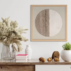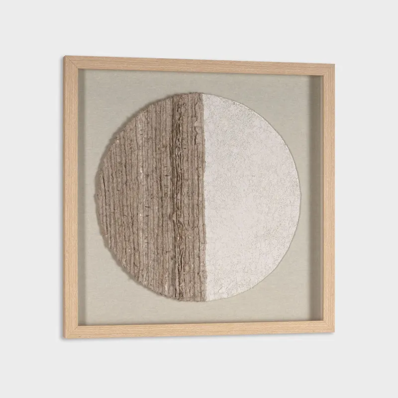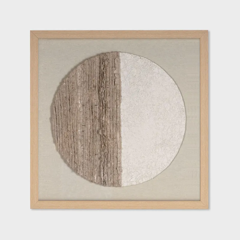 The 24" x 24" shadow box features two contrasting textures side by side within a neutral color palette. Made using hand laid paper pulp, the textures are visually intriguing as it plays with light and shadow, potentially evoking various interpretations or emotions from the viewer. The polycomposite frame radiates a sense of warmth and richness, enveloping the artwork in a subtle elegance, all beautifully showcased behind glass. The piece’s exploration of tactile qualities within a minimalist approach can make a powerful statement in any room setting. Dimensions: 24 W X 2 D X 24 H (in)