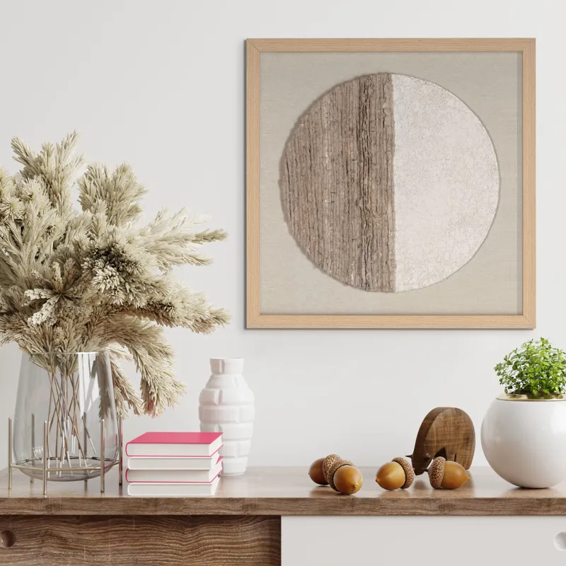 - The 24" x 24" polycomposite frame radiates a sense of warmth and richness, enveloping the artwork in a subtle elegance, all beautifully showcased behind glass.