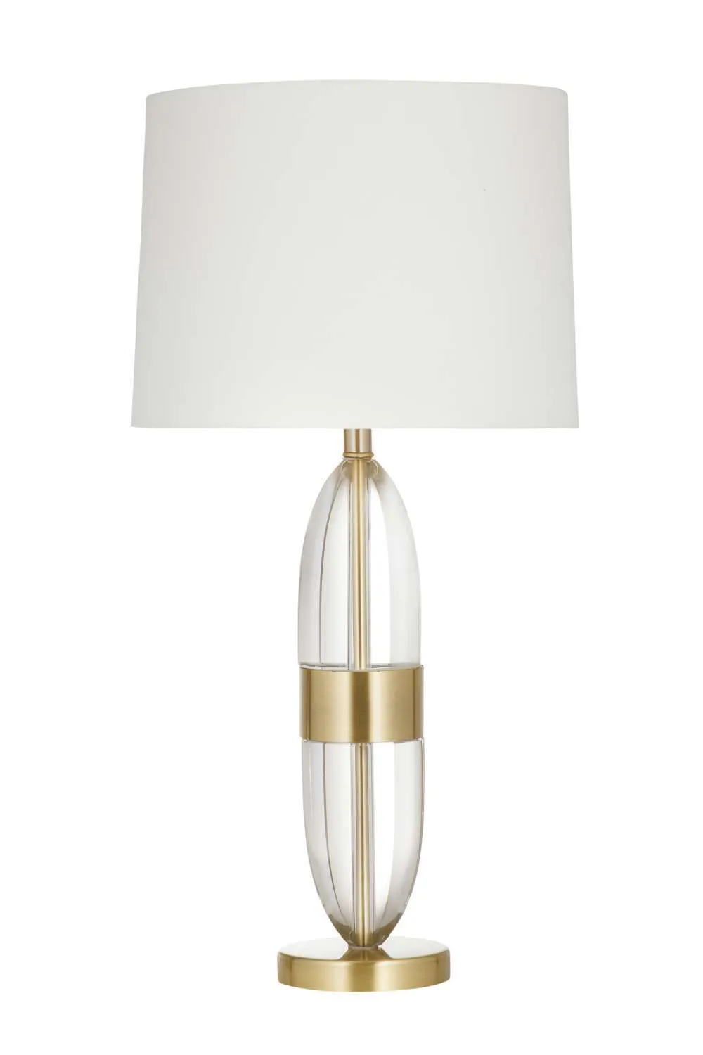 The Brompton Table Lamp blends traditional elegance with a touch of glam. Its pill-shaped crystal base is accented by brushed gold details, creating a refined and luminous presence. A white tapered drum shade completes the look, offering soft, balanced light that elevates any room with timeless sophistication.