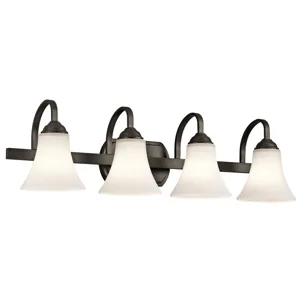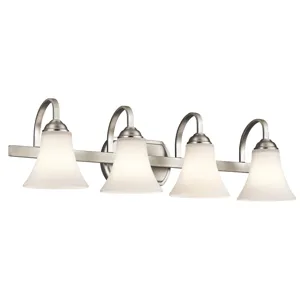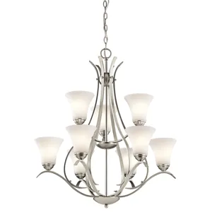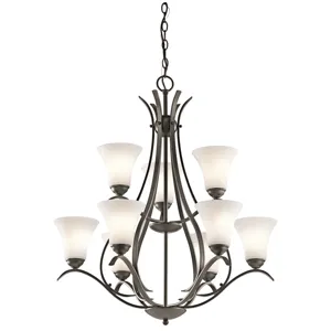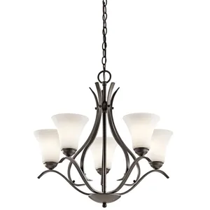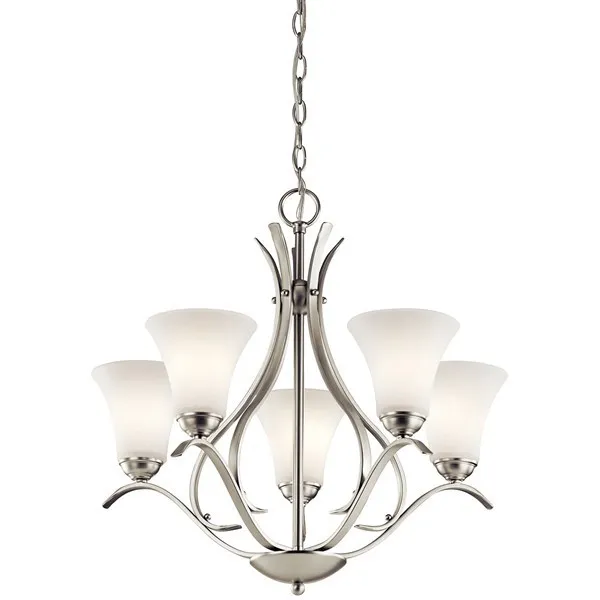 Youll love how this 5 light chandelier from the Keiran Collection blends traditional and soft touches to create a stylish look all its own. The smooth curves of the simple lines seem to caress the Satin etched glass as it holds it aloft. The perfect addition to any dcor.