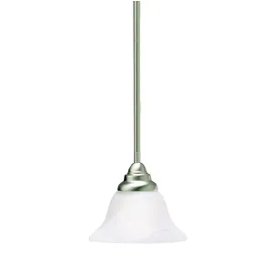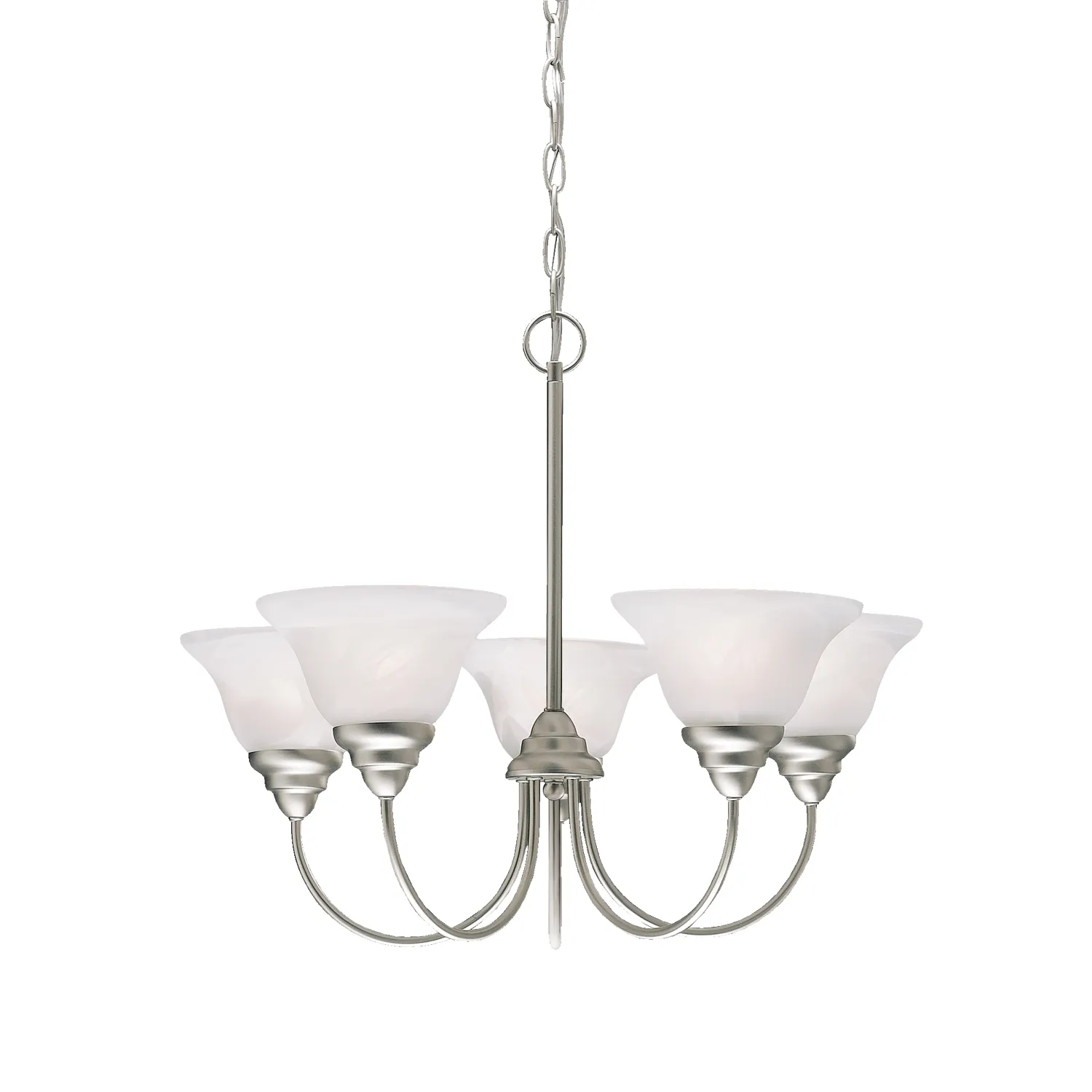 If you're on a tight budget but want timeless styling with a clean color palate and finish, the Telford Collection is the line of lighting you've been looking for. Even with its rich, classically inspired style, The Telford Collection manages to keep a competitive price point adding a level of quality that will accentuate your contemporary home. The beautiful allure of our Brushed Nickel finish has been combined with the fresh, frosted look of alabaster swirl glass and applied to a collection of goods that will service every area of the home. The 5-light chandelier uses 100-watt max. bulbs and measures 24" in diameter with a 17" body height. It includes 57" of extra lead wire with 6' of chain.