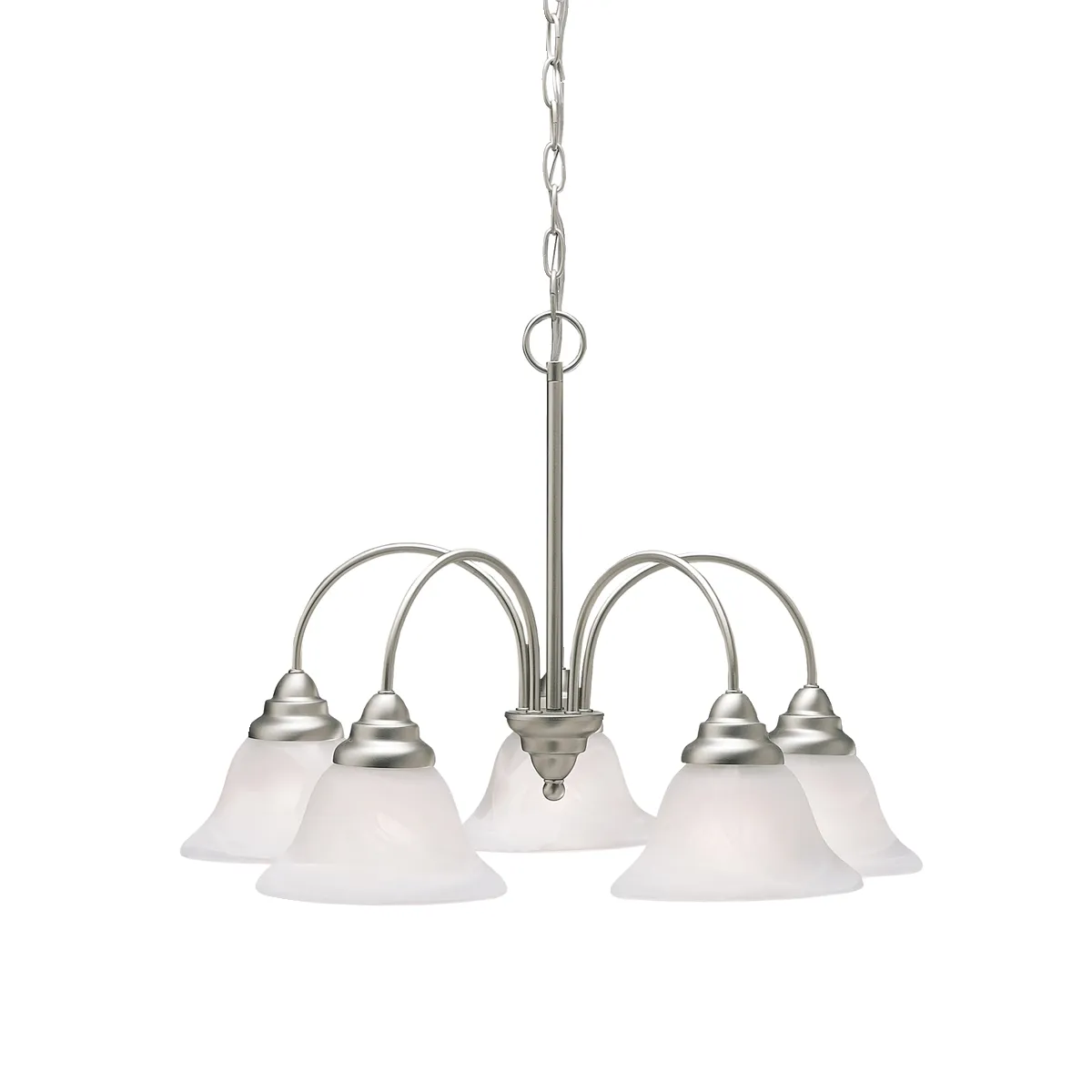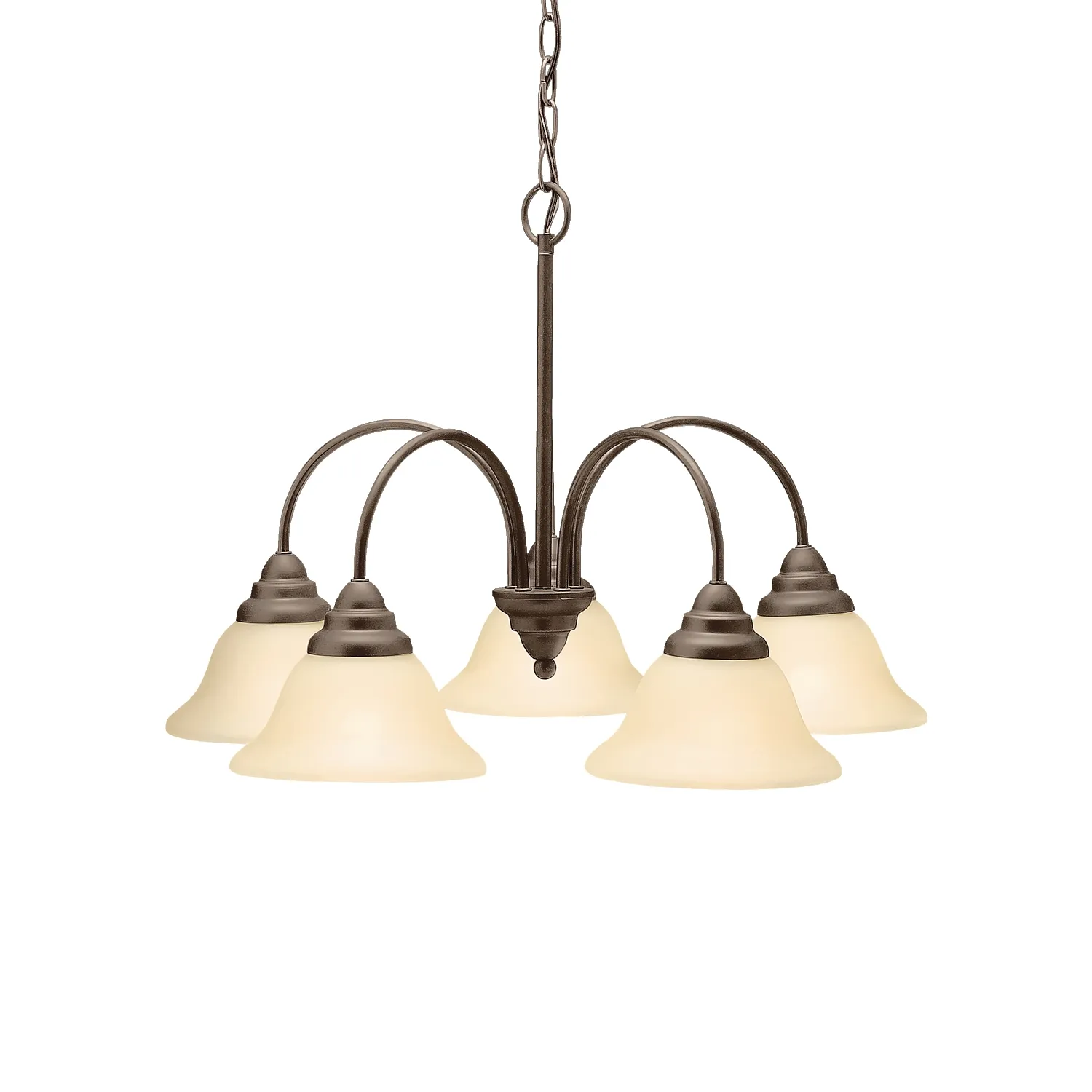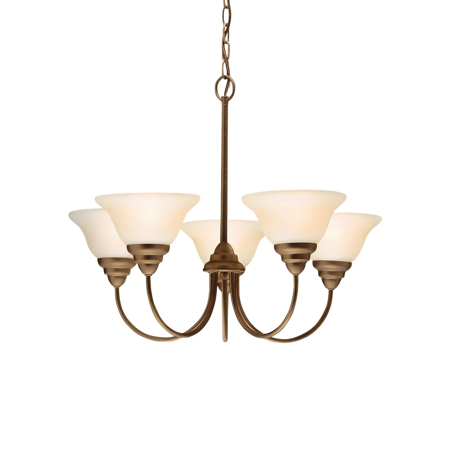 If you're on a tight budget but want timeless styling with a warm color palate and finish, the Telford Collection is the line of lighting you've been looking for. Even with its rich, classically inspired style, The Telford Collection manages to keep a competitive price point adding a level of quality that will accentuate your contemporary home. The beautiful allure of our Olde Bronze finish has been combined with the fresh, frosted look of umber etched glass and applied to a collection of goods that will service every area of the home. The 5-light chandelier uses 100-watt max. bulbs and measures 24" in diameter with a 17" body height. It includes 57" of extra lead wire with 6' of chain.