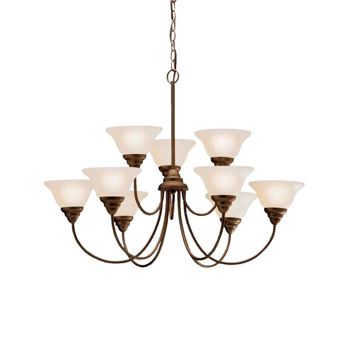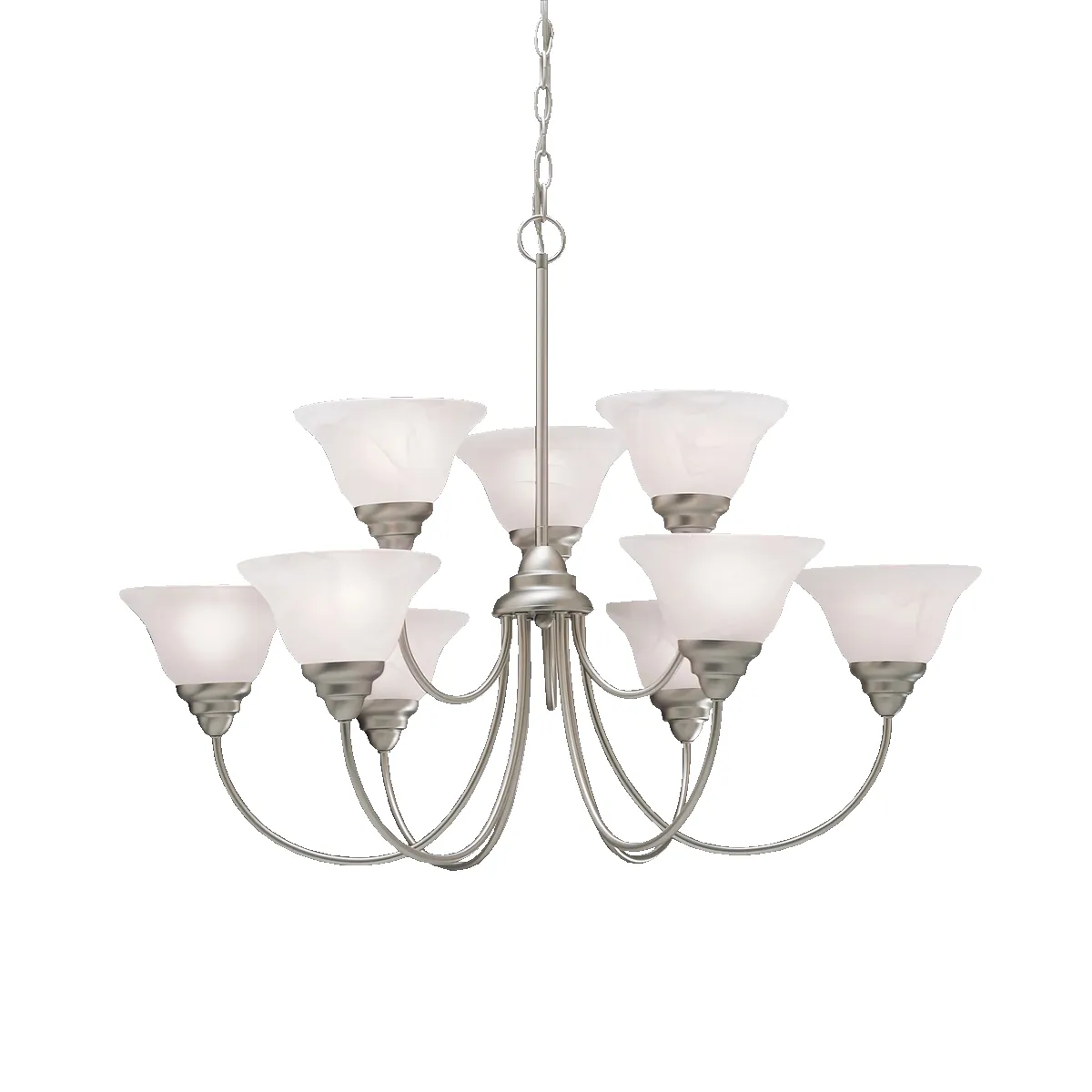 If you're on a tight budget but want timeless styling with a clean color palate and finish, the Telford Collection is the line of lighting you've been looking for. Even with its rich, classically inspired style, The Telford Collection manages to keep a competitive price point adding a level of quality that will accentuate your contemporary home. The beautiful allure of our Brushed Nickel finish has been combined with the fresh, frosted look of alabaster swirl glass and applied to a collection of goods that will service every area of the home. The 2-tiered, 9-light chandelier uses 100-watt max. bulbs and measures 34" in diameter with a 25" body height. It includes 57" of extra lead wire with 6' of chain.
