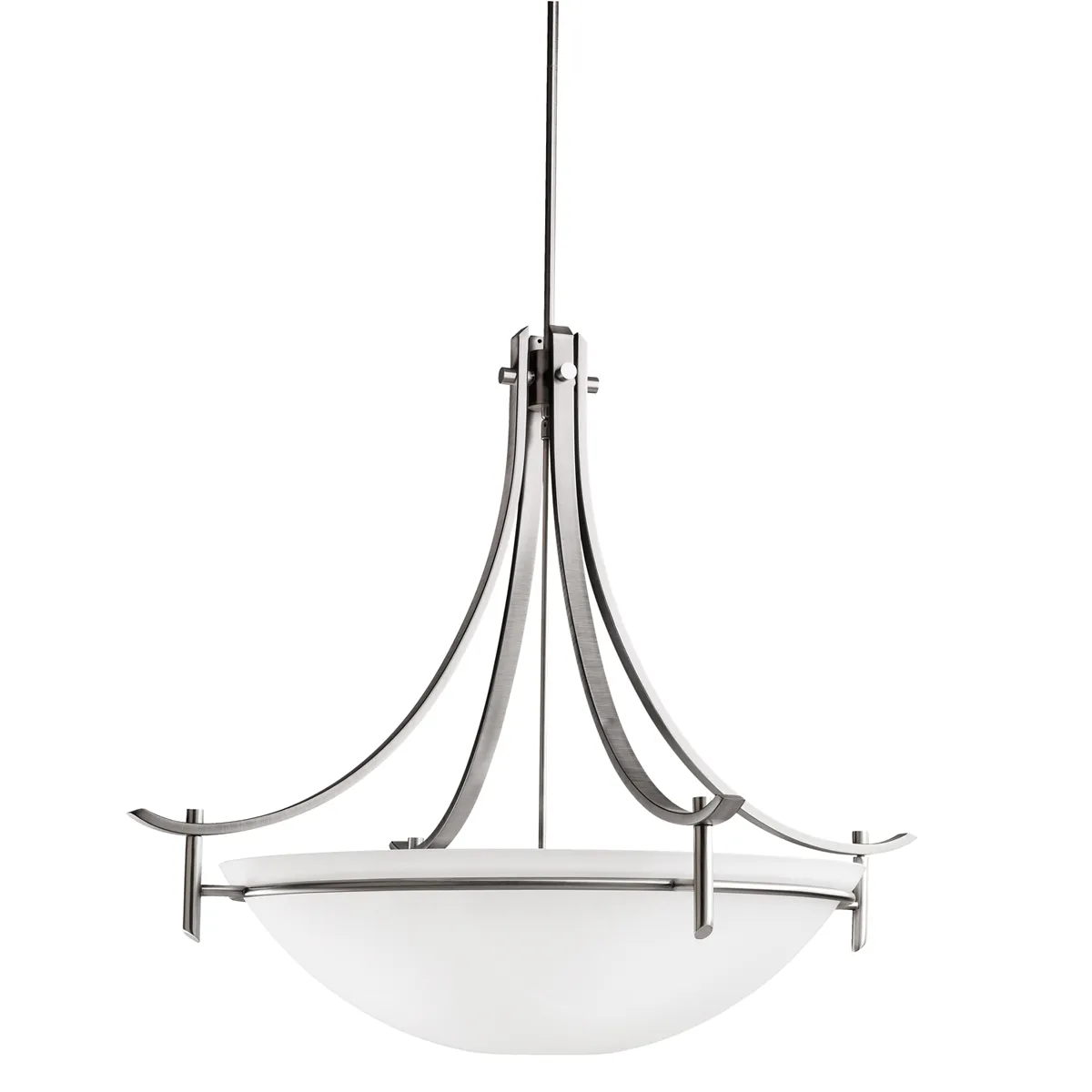 The Olympia Collection brings a modern twist on the classic aesthetic to create a new form the likes of which has not been seen before. The curvilinear, flowing arms create a clean, contemporary profile for your home. The Antique Pewter finish combined with Satin-etched cased opal glass presents a natural color palate capable of matching any dcor. Now, the Olympia Collection offers its unique look as an inspirational inverted pendant. It uses a 5-light design that requires 150-watt max. bulbs to light the Satin-etched cased opal glass, creating glowing light with chic sophistication. It measures 36" in diameter and 31" high.