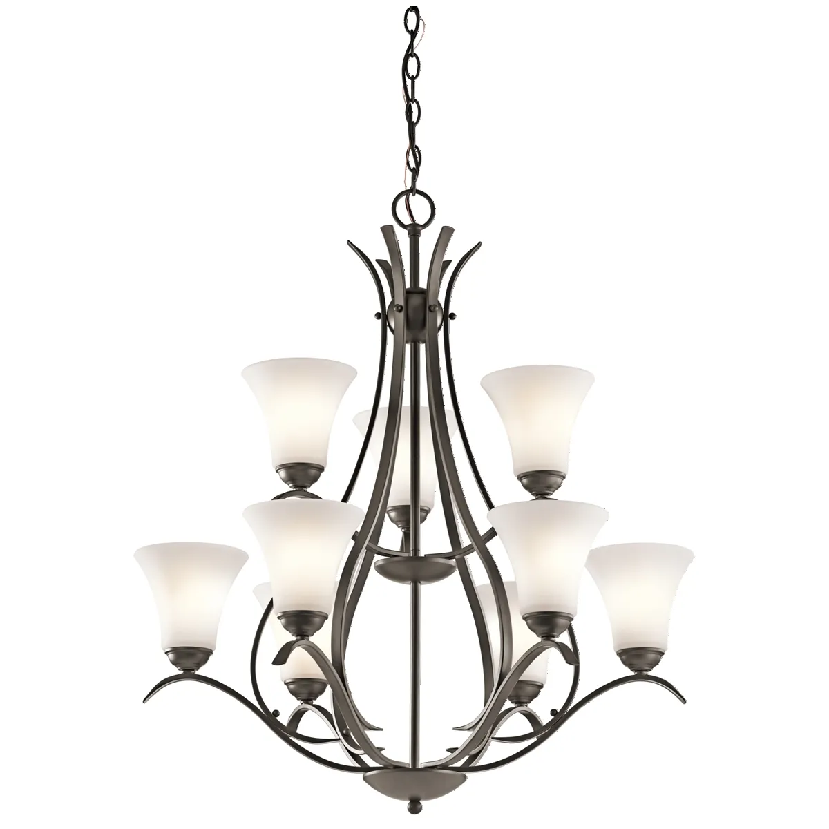 Youll love how this 9 Light 2 Tier chandelier from the Keiran Collection blends traditional and soft touches to create a stylish look all its own. The smooth curves of the simple lines seem to caress the Satin etched glass as it holds it aloft. The perfect addition to any dcor.