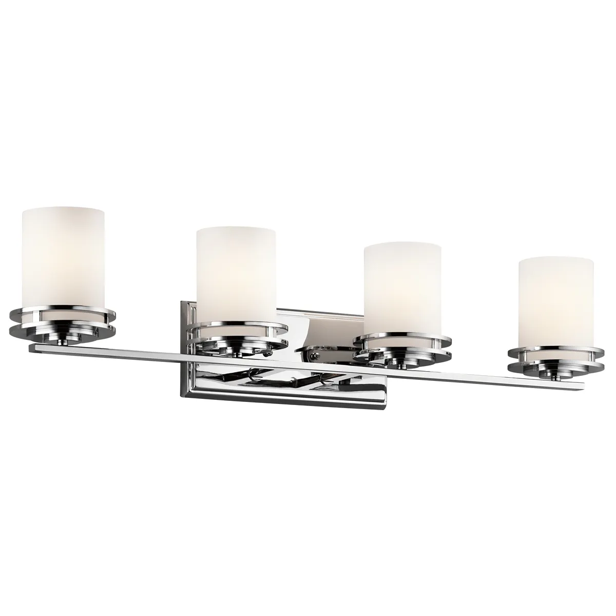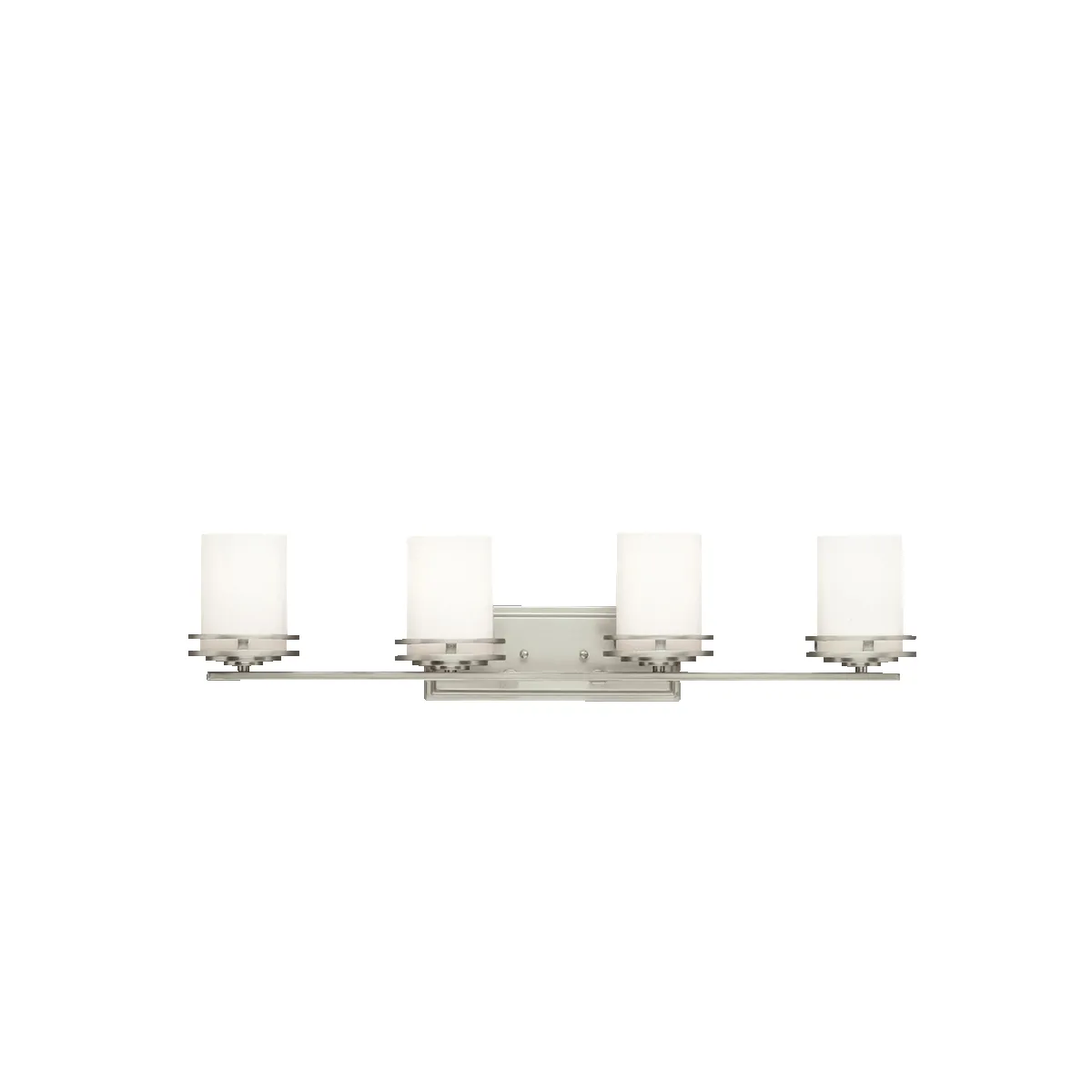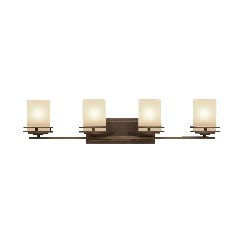 Named after renowned Dutch architect, Hendrik Berlage, the Hendrik Collection is a gorgeous family of contemporary fixtures that honor the man who was regarded by many as the "Father of Modern architecture". Much like Berlage himself, The Hendrik Collection is regarded as an intermediary between modern and traditional styles and is now suited for your bathroom. Classic lines are enhanced with a soft touch of current style cues to work in a number of aesthetic environments. The antique look provided by our Olde Bronze finish is partnered with the etched umber glass for a fantastic warm and frosted color palate. The 4-light wall sconce uses a 100-watt max. bulb and measures 34" wide by 8" high. This fixture may be installed with the glass up or down and is U.L. listed for damp location.