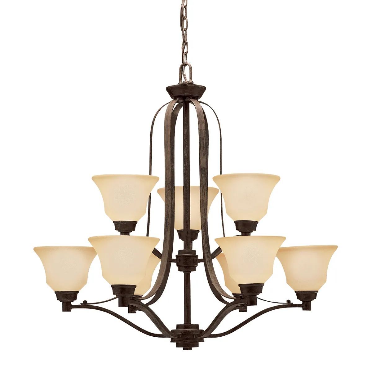 This classic 9 light chandelier from the Langford™ collection is a timeless accent fitting for any space. The Olde Bronze™ finish and Satin Etched Glass combine to create a refined statement.