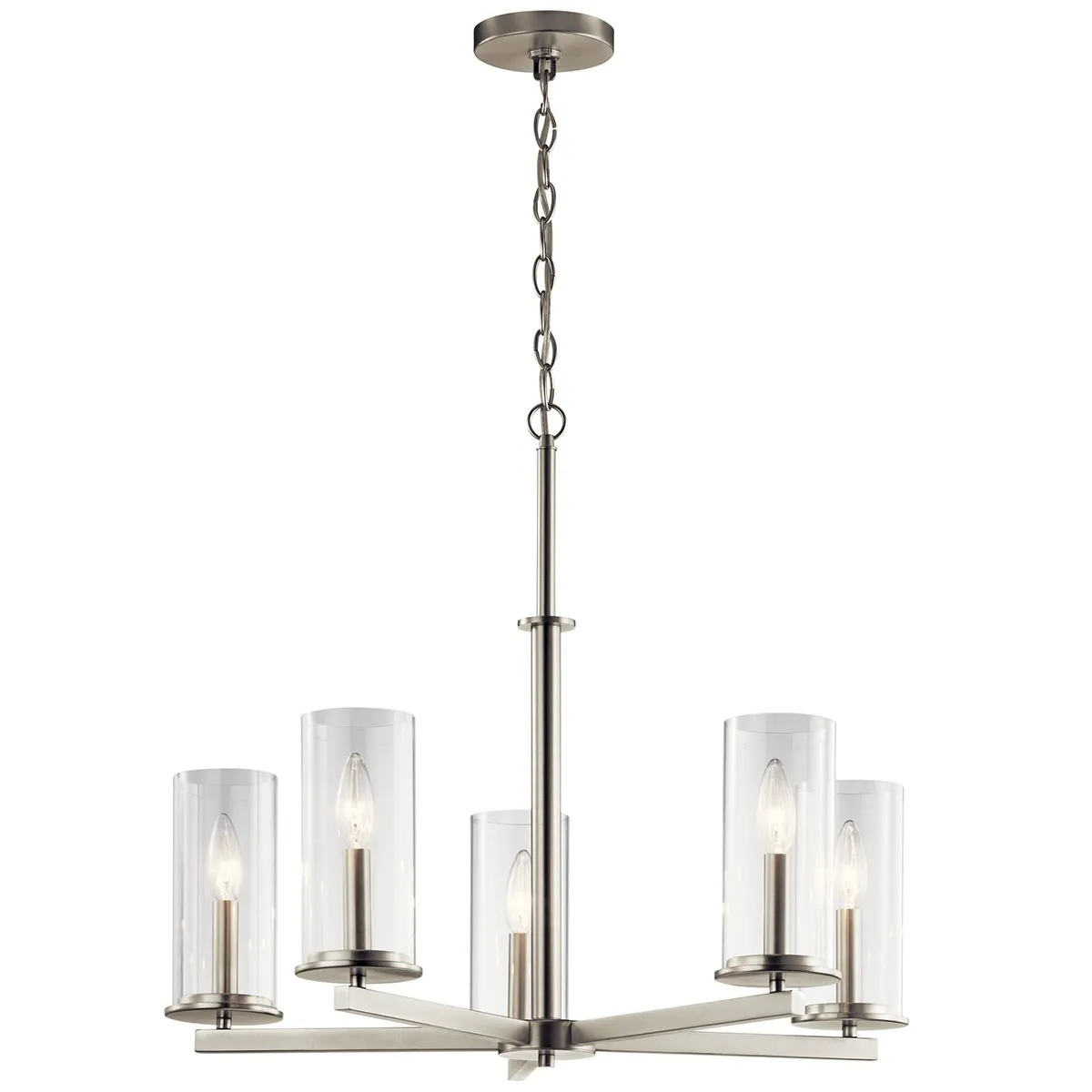The 5 light Crosby chandelier in Brushed Nickel finish and clear glass uses 60 watt (max.) bulb equivalent. It measures 26.25" in width and 22.25" in body height. It comes complete with 54" of extra lead wire for customizable length and height.