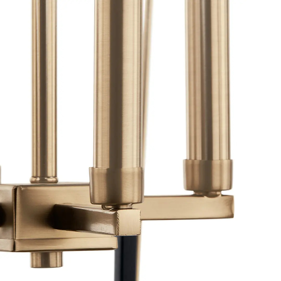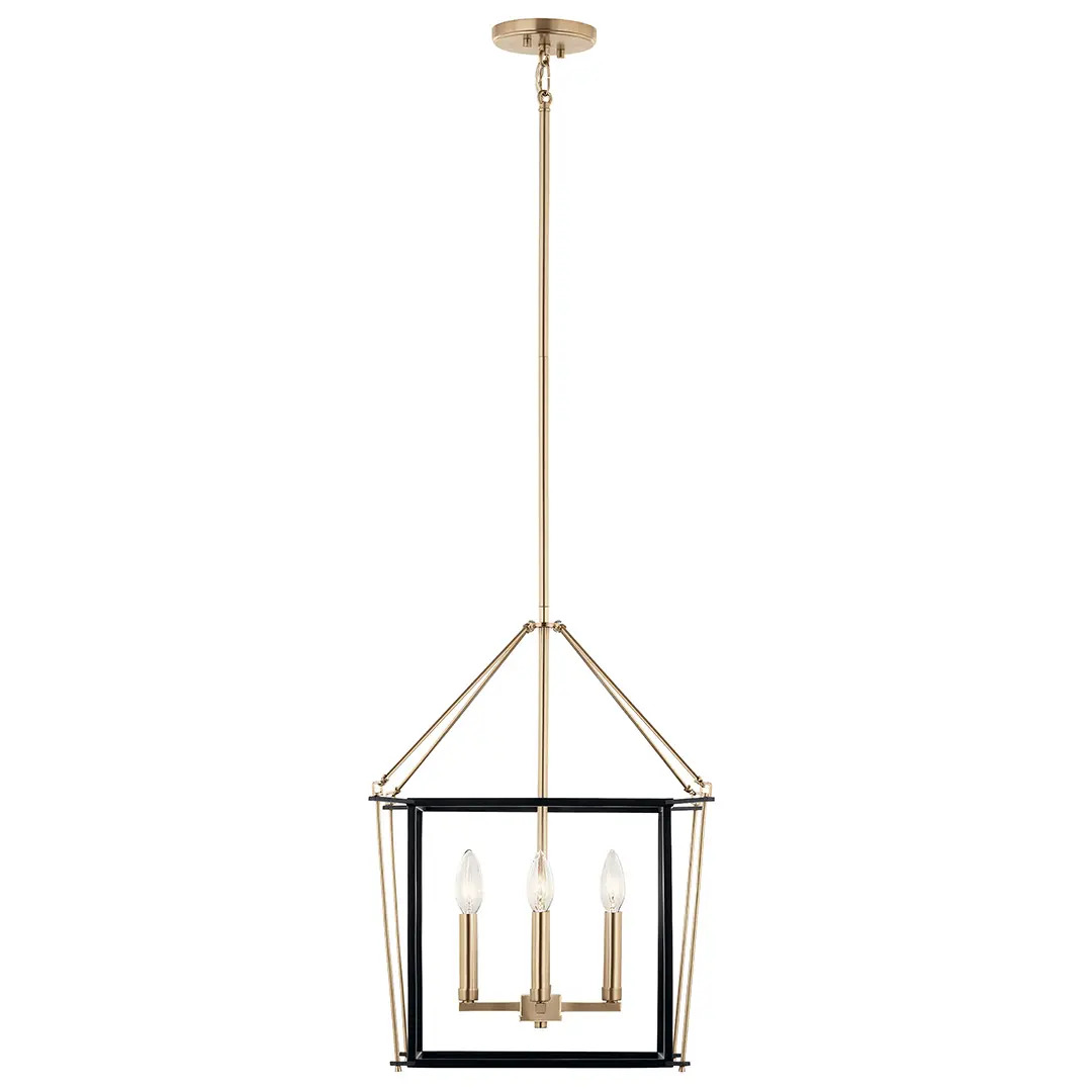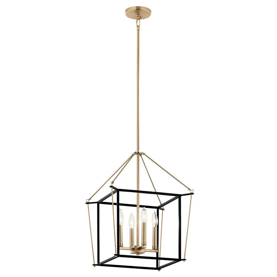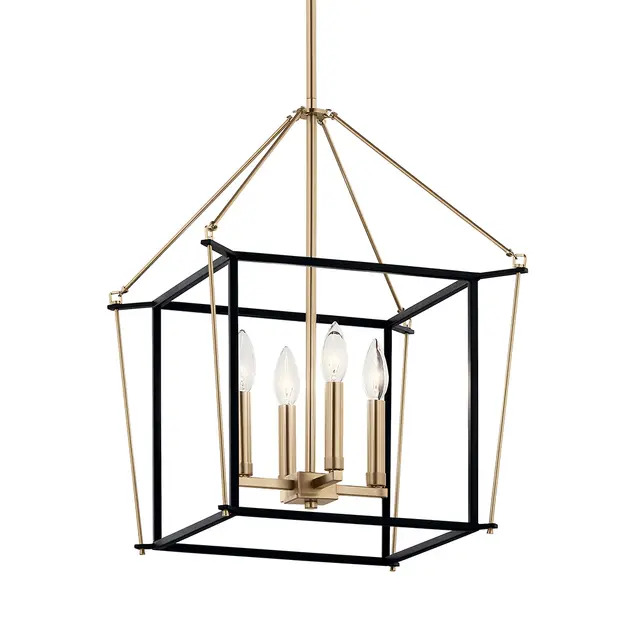 The Eisley foyer pendant's open-framed body design illuminates in a minimalist, modern aesthetic. Its contrasting mixed finish shapes are connected ever-so-slightly with a hook and eye at each corner of the cage. This foyer pendant is constructed without glass, giving the illusion that the fixture is floating.