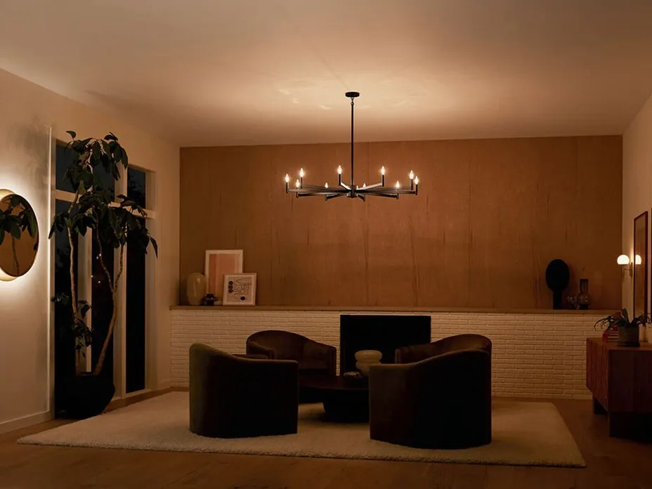 A large yet visually "light" sculptural piece, the Erzo 10 light chandelier brings a quiet, understated elegance wherever it goes. Its simple clean lines and candlestick design allow light to shine throughout the entire room--creating a warm comforting glow. An on-trend addition in the lighting space, Erzo's oversized diameter easily meets the needs to coordinate with larger dining tables.