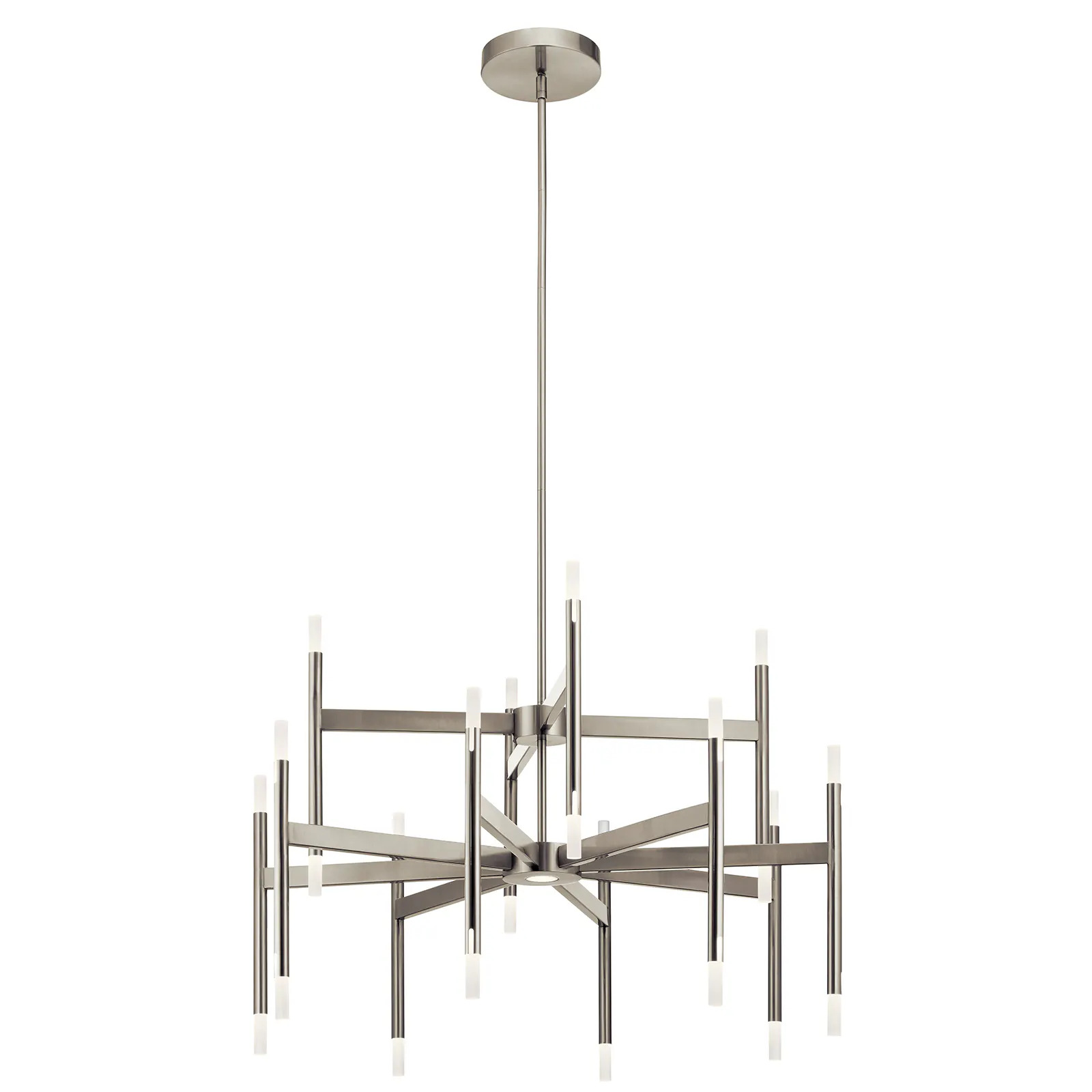 An inviting Brushed Nickel Finish and etched Acrylic Diffusers make Kizette™ an elegant focal piece in any space.