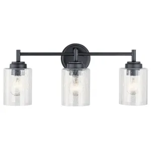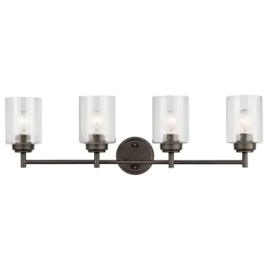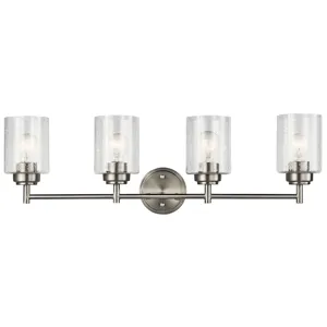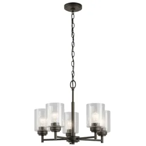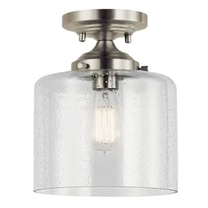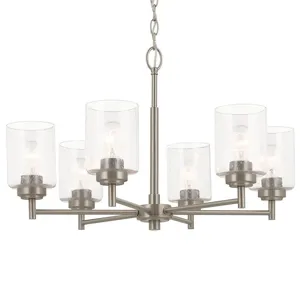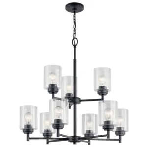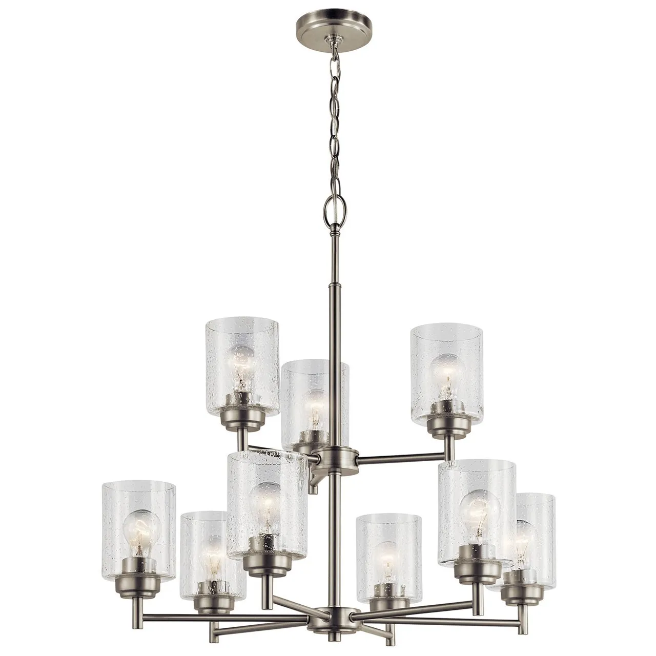 The Winslow 9 light 2 tier chandelier features a brushed nickel finish and clear seeded glass. It uses a medium base 75 watt (max.) or equivalent LED bulb and measures 27" wide and 27" body height.