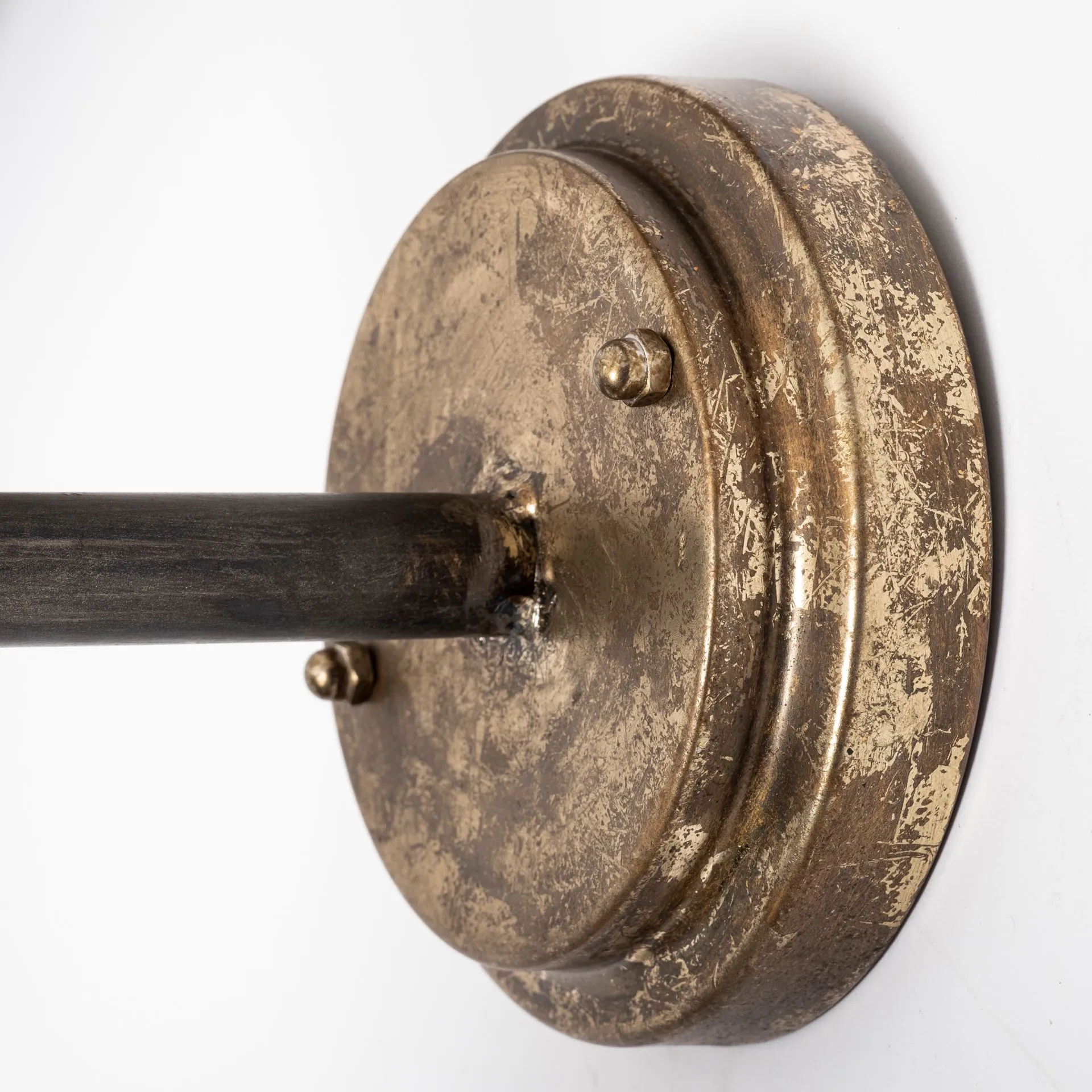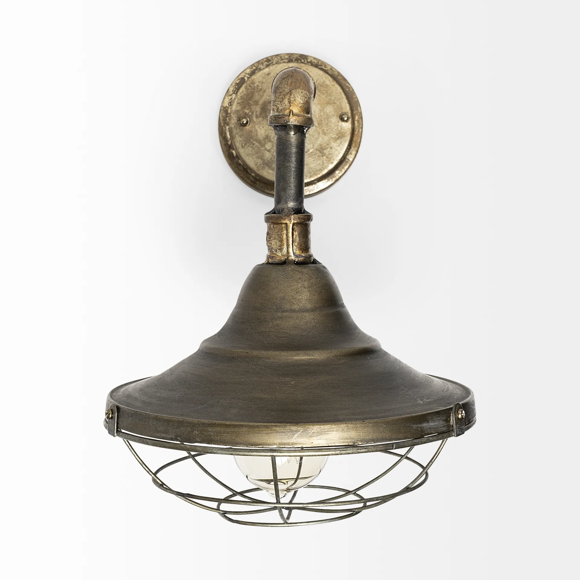The Agadir is a unique, industrially inspired wall sconce featuring a conical lamp shade with a caged bulb protector.