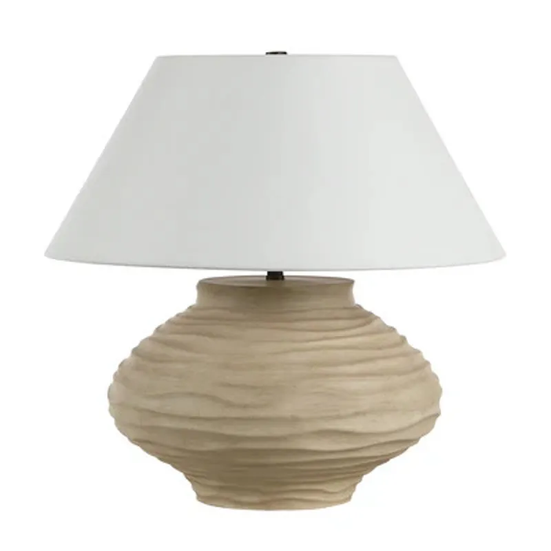The Ola table lamp exudes natural charm with its hand-crafted appearance and carved beige base. Paired with an ivory linen shade and dark antique bronze accents, it offers both sculptural beauty and soft illumination. Perfect as a statement piece on an end table or in pairs on a buffet, it brings warmth and organic elegance to any contemporary space.
