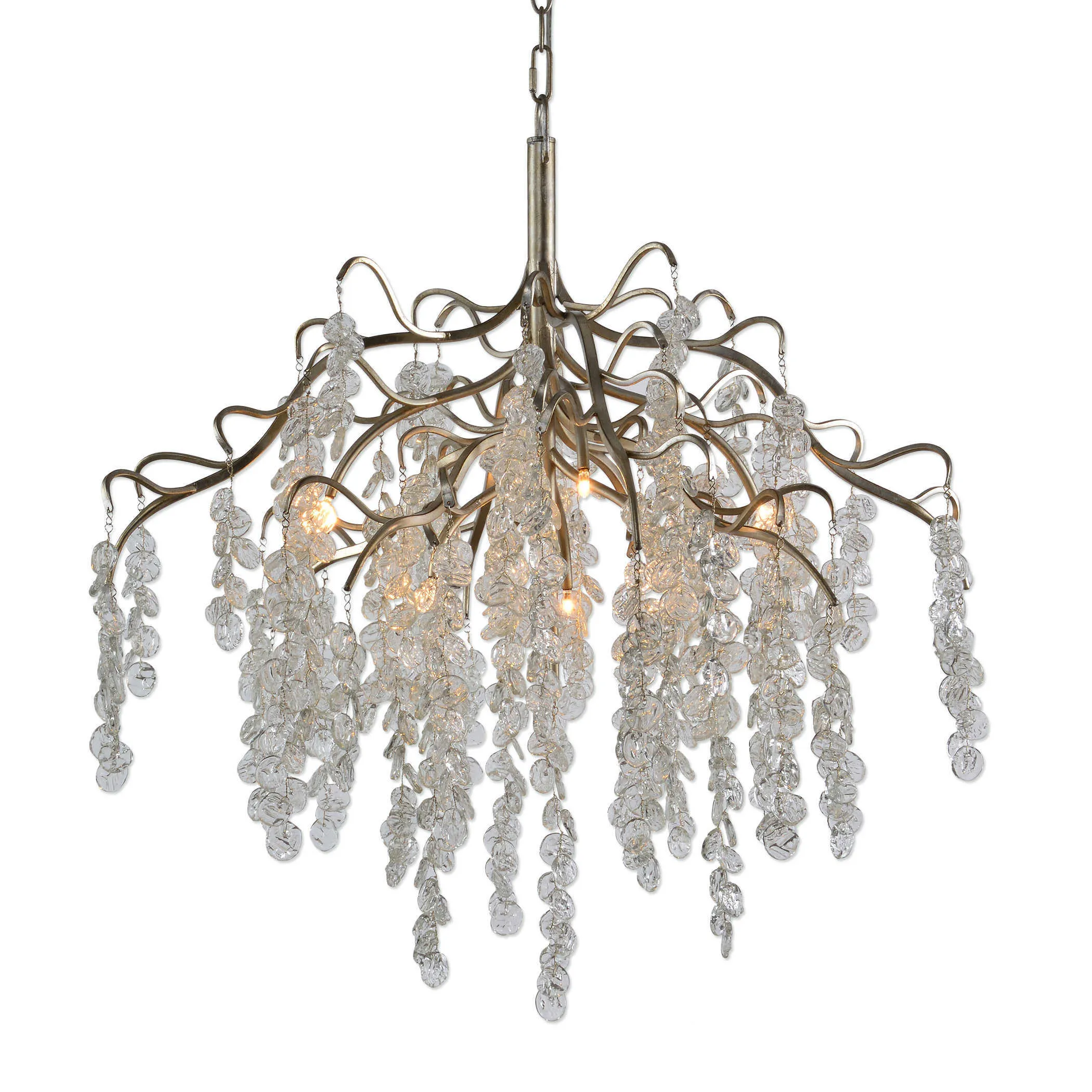 The Boreas chandelier features cascades of clear glass buttons dripping from burnished silver Champagne leaf branches. Nestled in the shimmering branches are 7 petite 20watt halogen low voltage bulbs that are included with this transitional fixture.