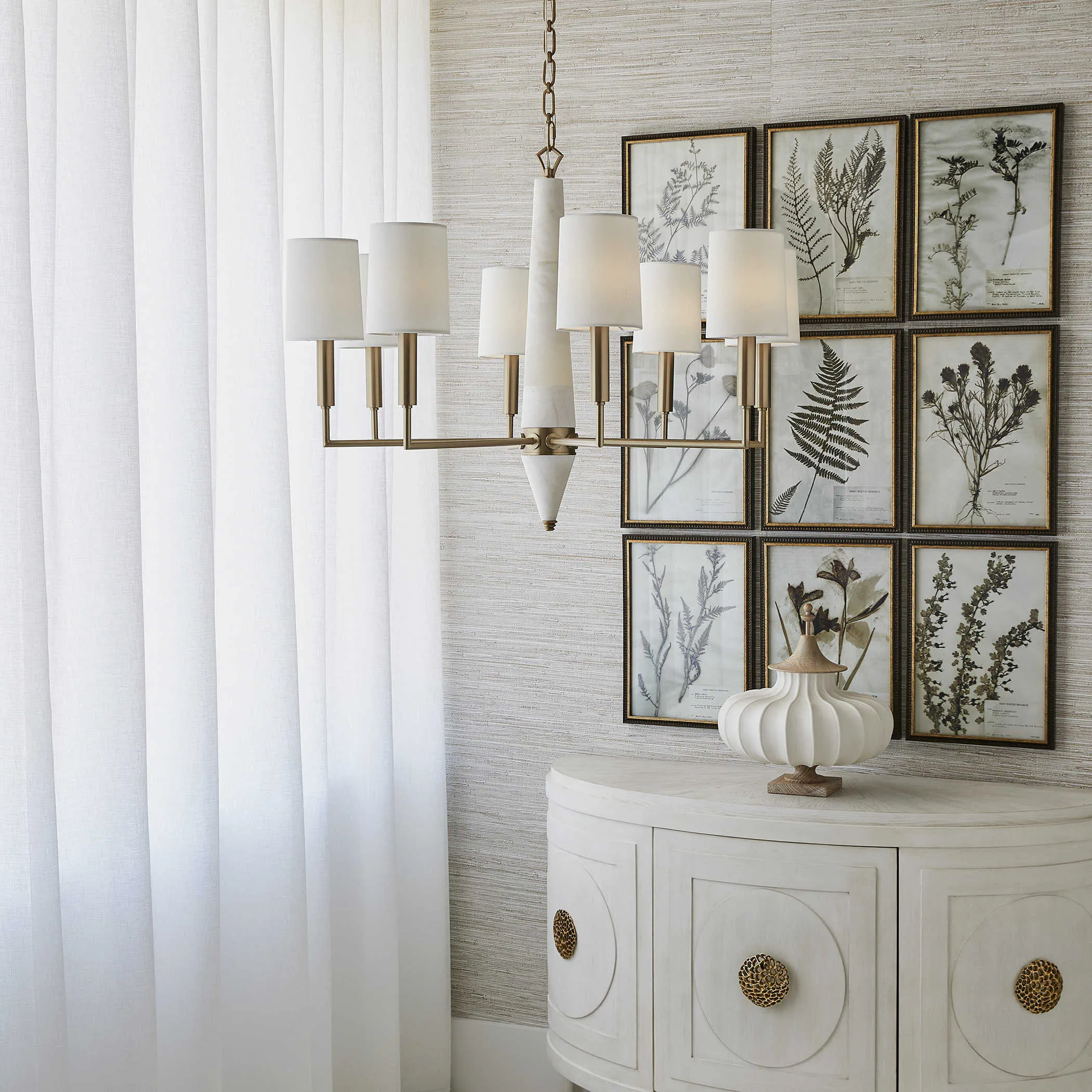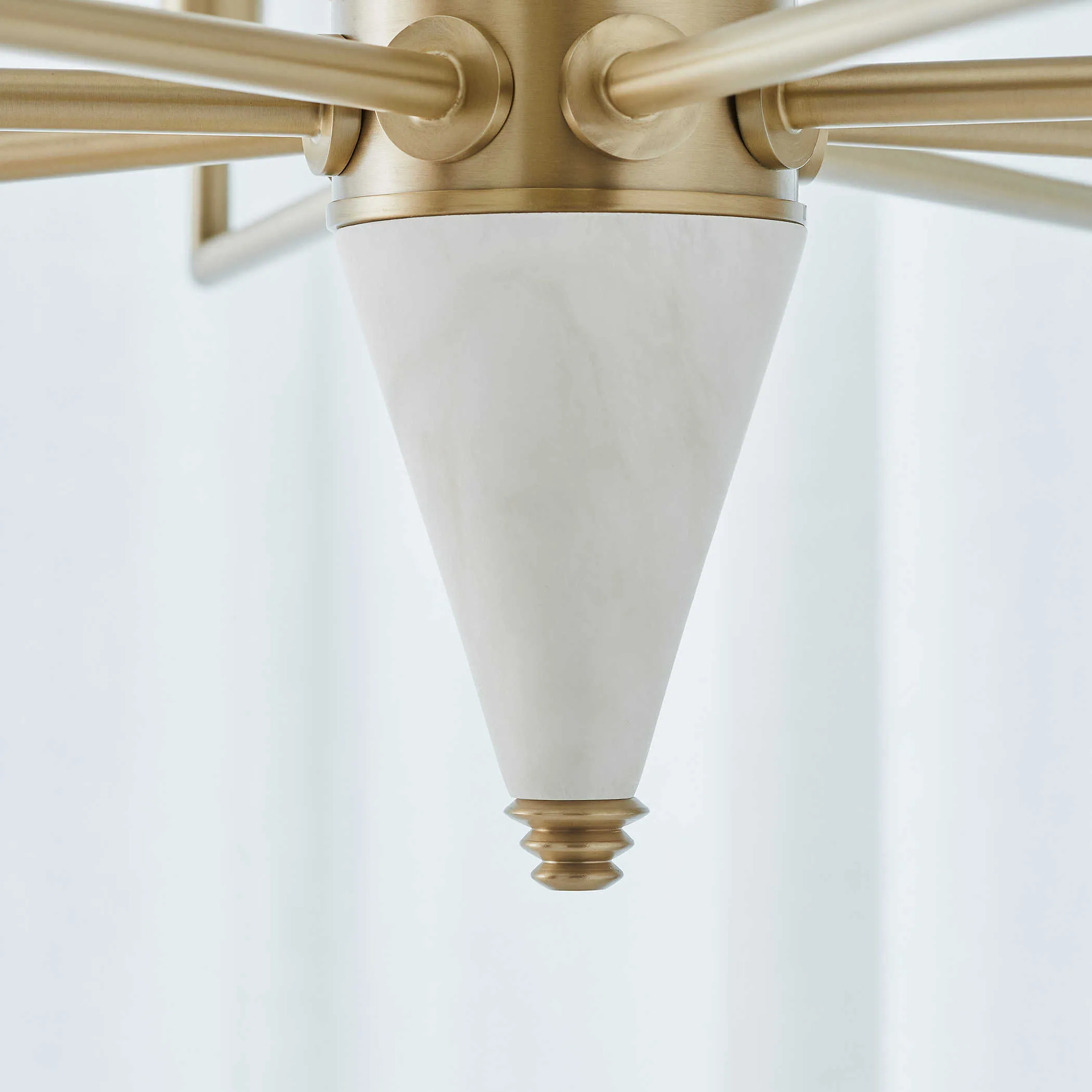 The Gathering 8 Light Chandelier showcases classic French art deco details that have then been updated for today's modern needs. The clean alabaster column tapers and is finished with a reverse finial detail. Given the nature of natural alabaster, some will be more opaque while others will contain more dark veining, creating a truly unique look. The eight arms, in rich brass finish, are angled for a more modern update, but then are capped with elegant, white silk-like shades. No detail is overlooked, the custom chain reflects an alternating pattern of oval and round links made from square shaped tubing. Includes 8-60 watt max, candelabra sockets. Supplied with 20' wire and 7’ chain for adjustable installation.