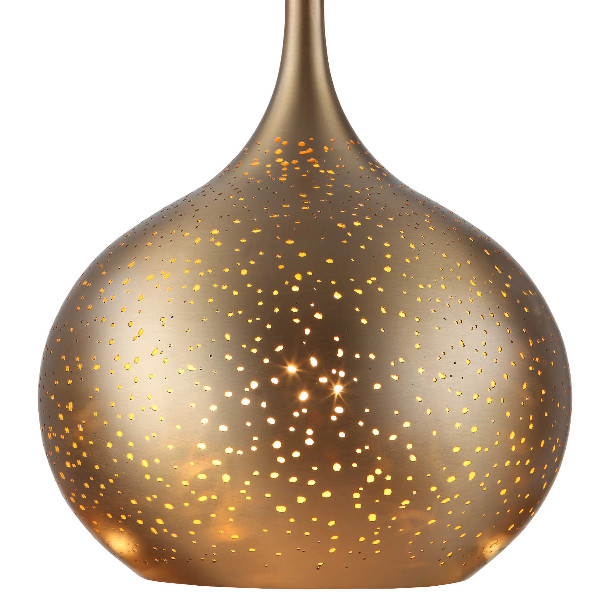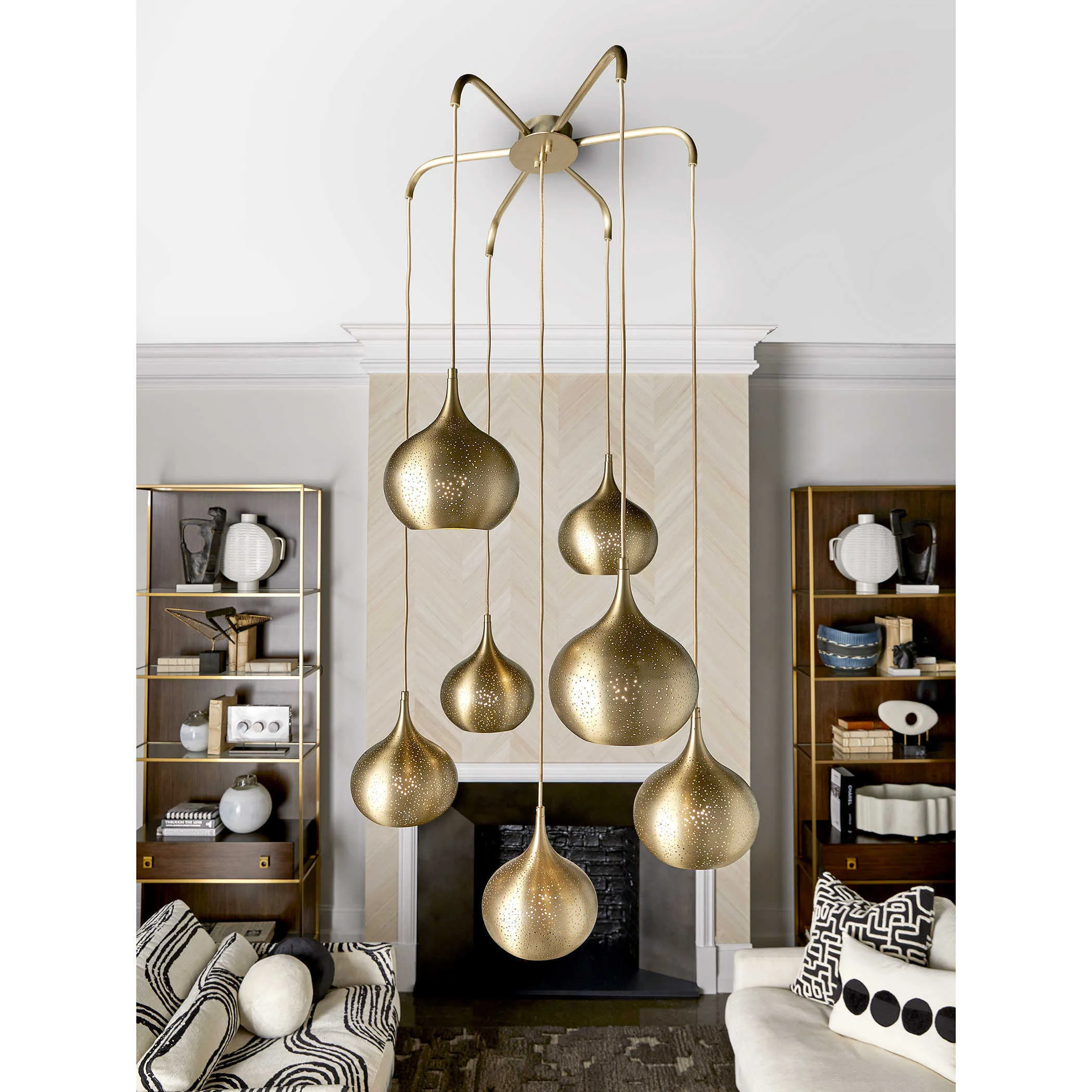 A romantic shape used in architecture across the world for millennium, the gold onion dome was the inspiration for the stunning Golden Onion Chandelier. Made of steel, the shade is acid-etched to create a unique pattern casting a starry reflection and an inner glow. Finished in rich brass, featuring a seven- arm spider, functional ambient light is supplied through the open bottom of each shade. 7-60 watt max, Edison sockets. Bulbs not included. Supplied with 11 feet of neutral color fabric-covered cords lengths so you can adjust to your desired height.