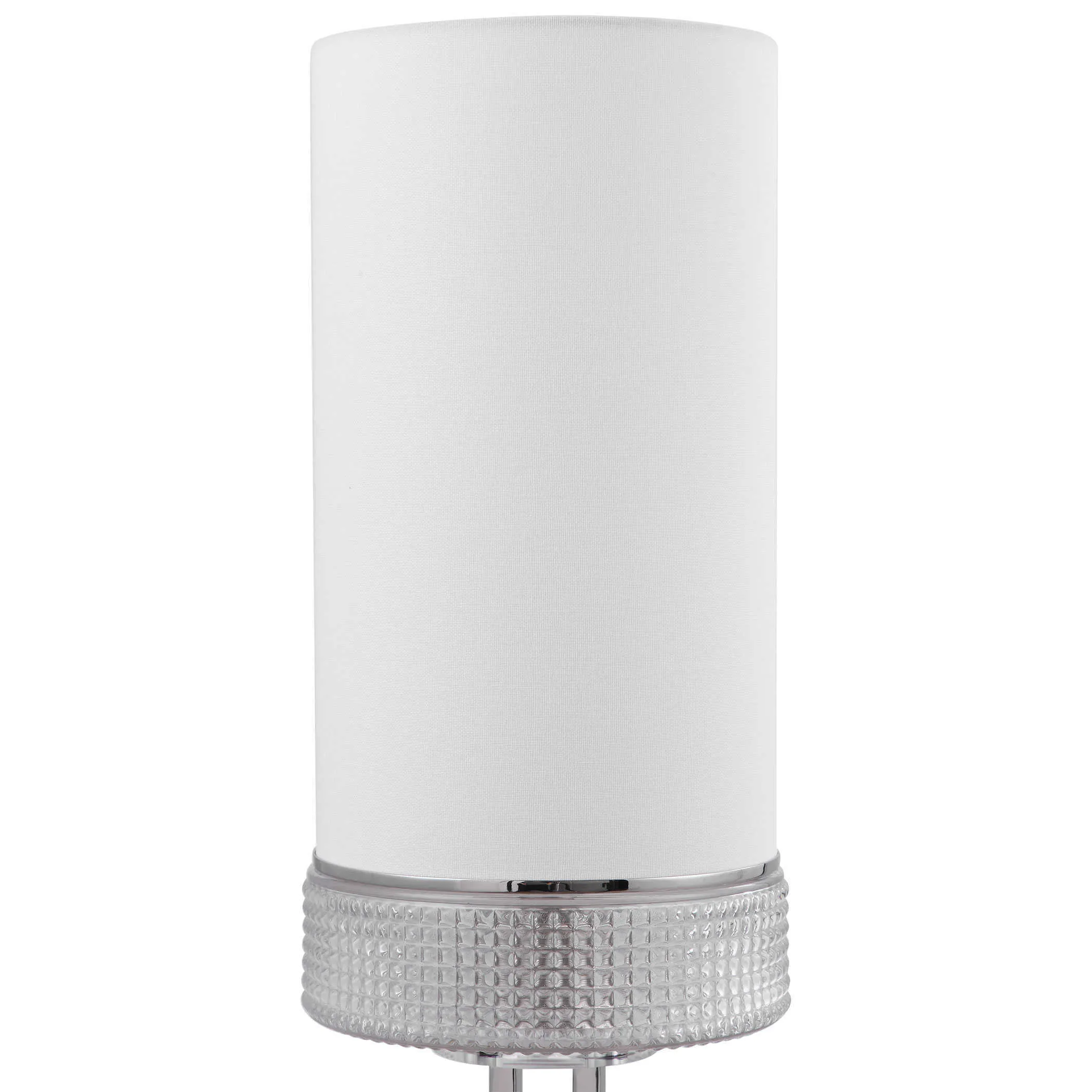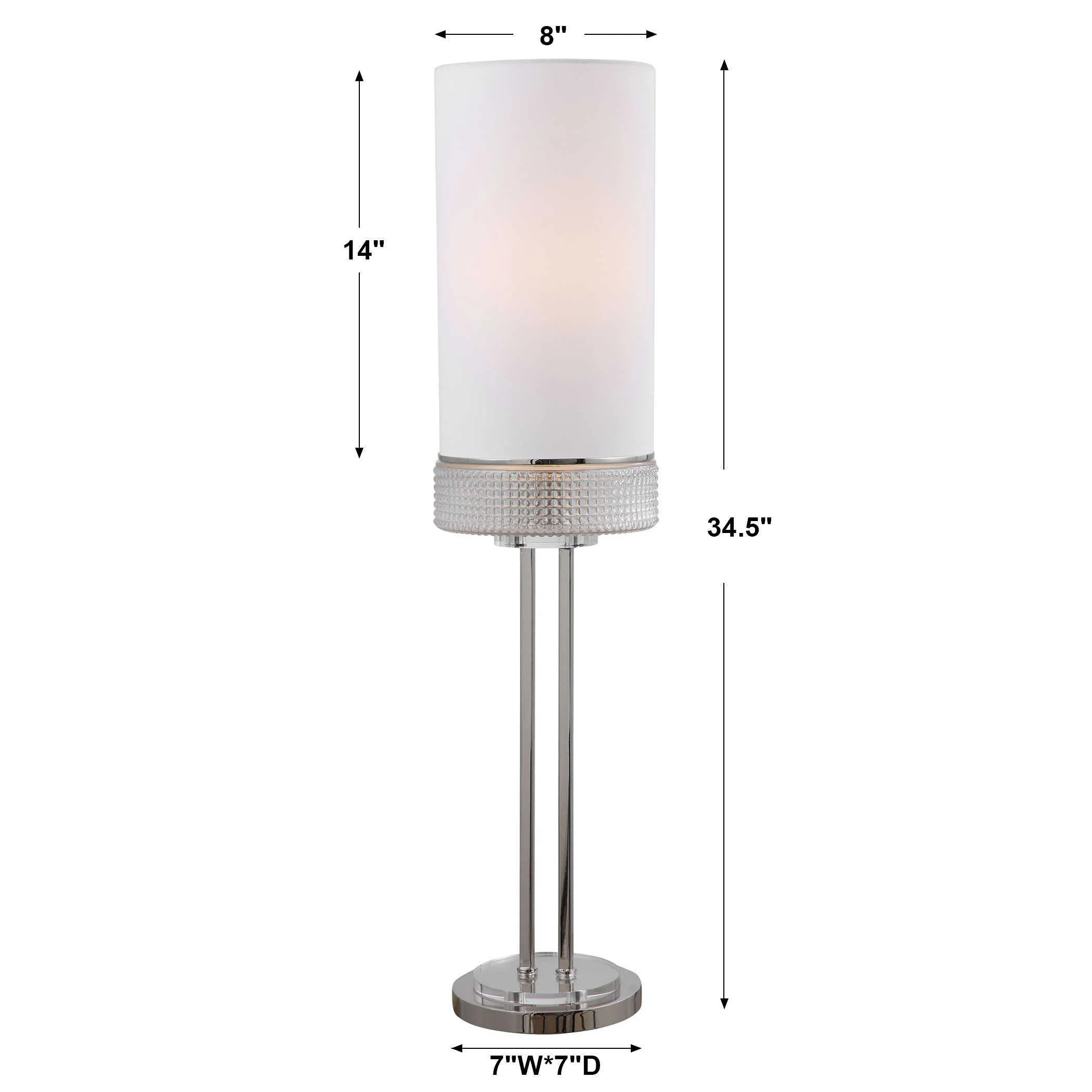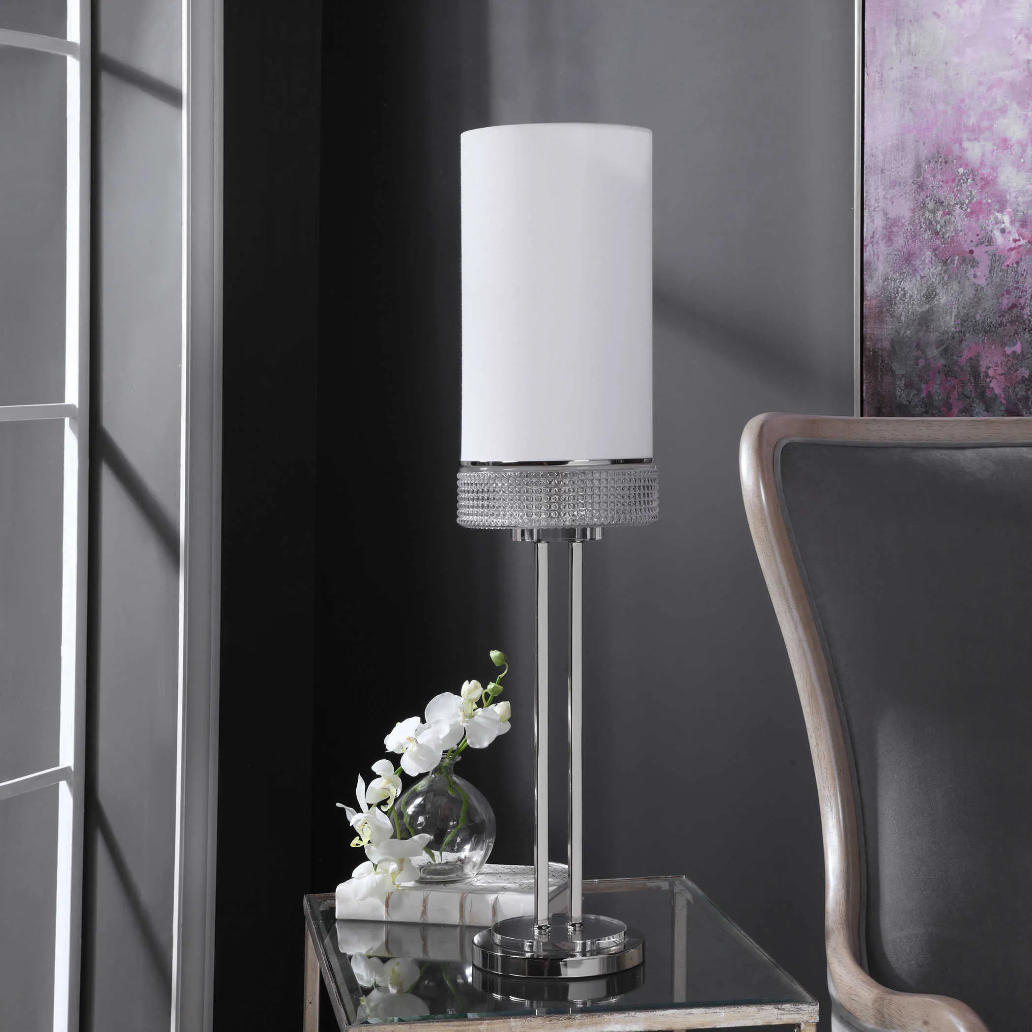 Showcasing a refined elegance this buffet lamp design features a polished nickel base, accented with a beaded textured, blown glass shade diffuser and crystal detail. The white fabric round drum shade is accented by polished nickel bottom trim.