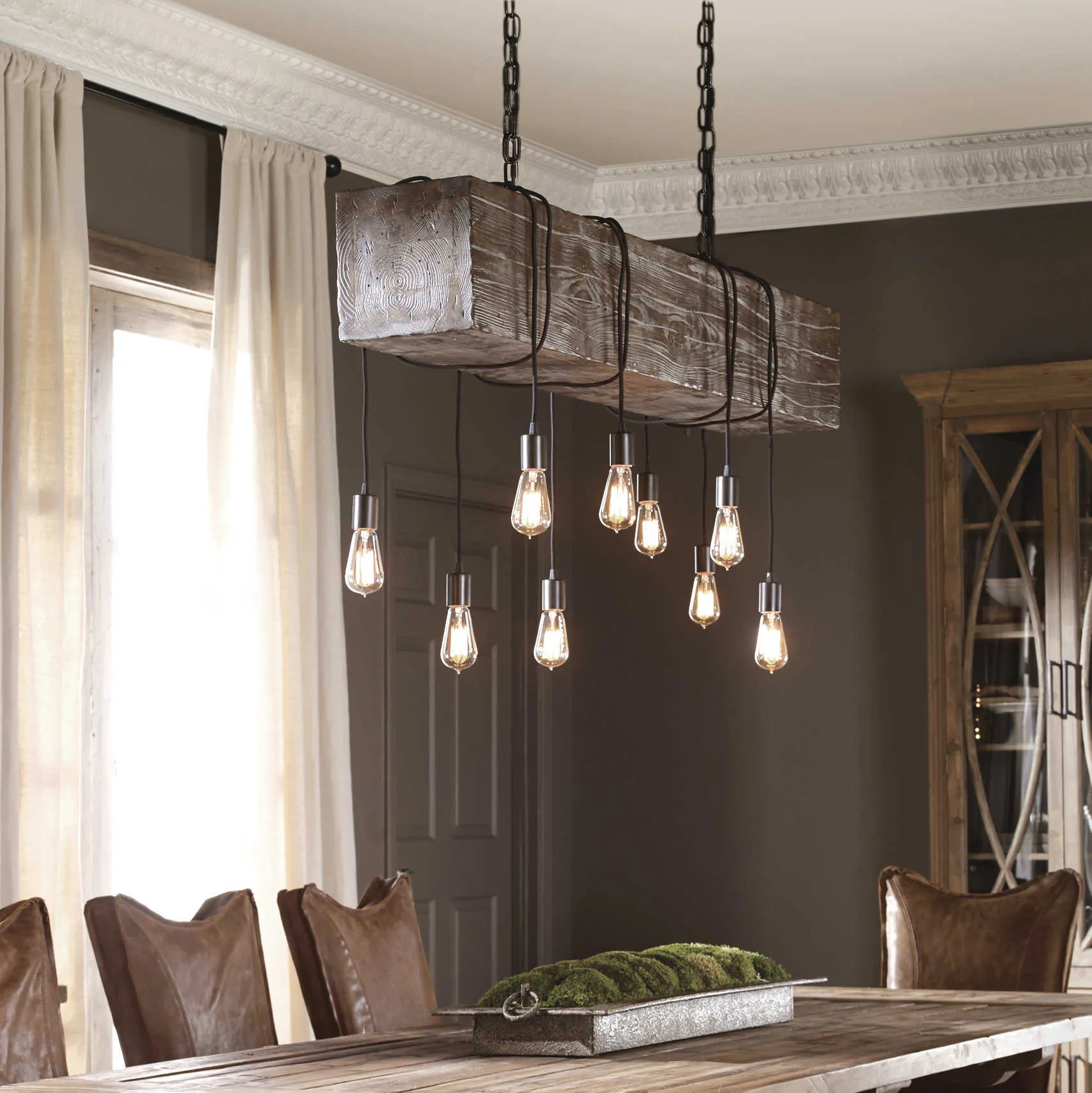 Rough, distressed railroad tie pendant of Espresso stained worn wood with dark bronze metal accents & heavy chain. This trestle pendant includes 9-60watt BT58 antique decorative style bulbs, that hang from cloth covered cords and sockets that wrap around the wood, enhancing its rustic appeal.