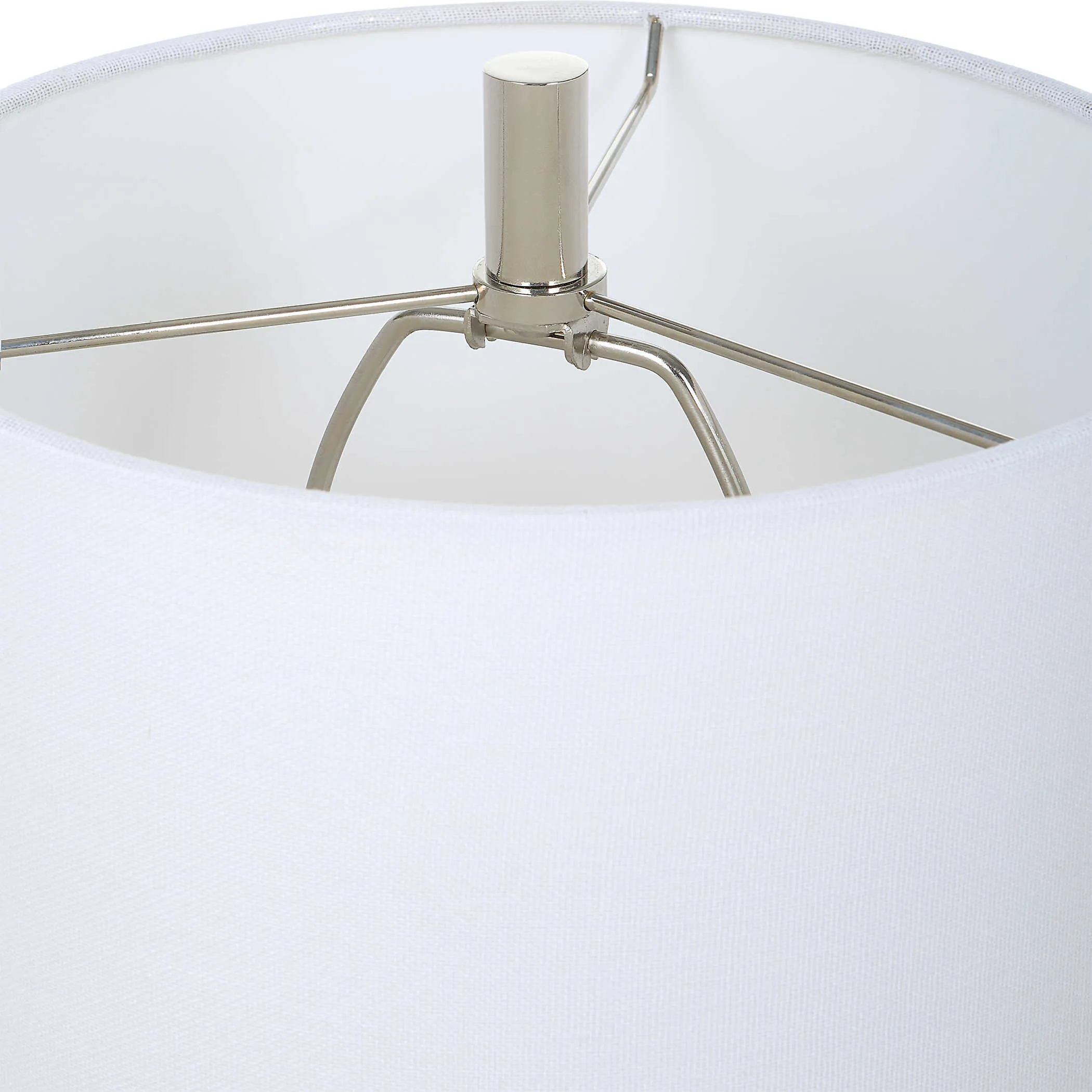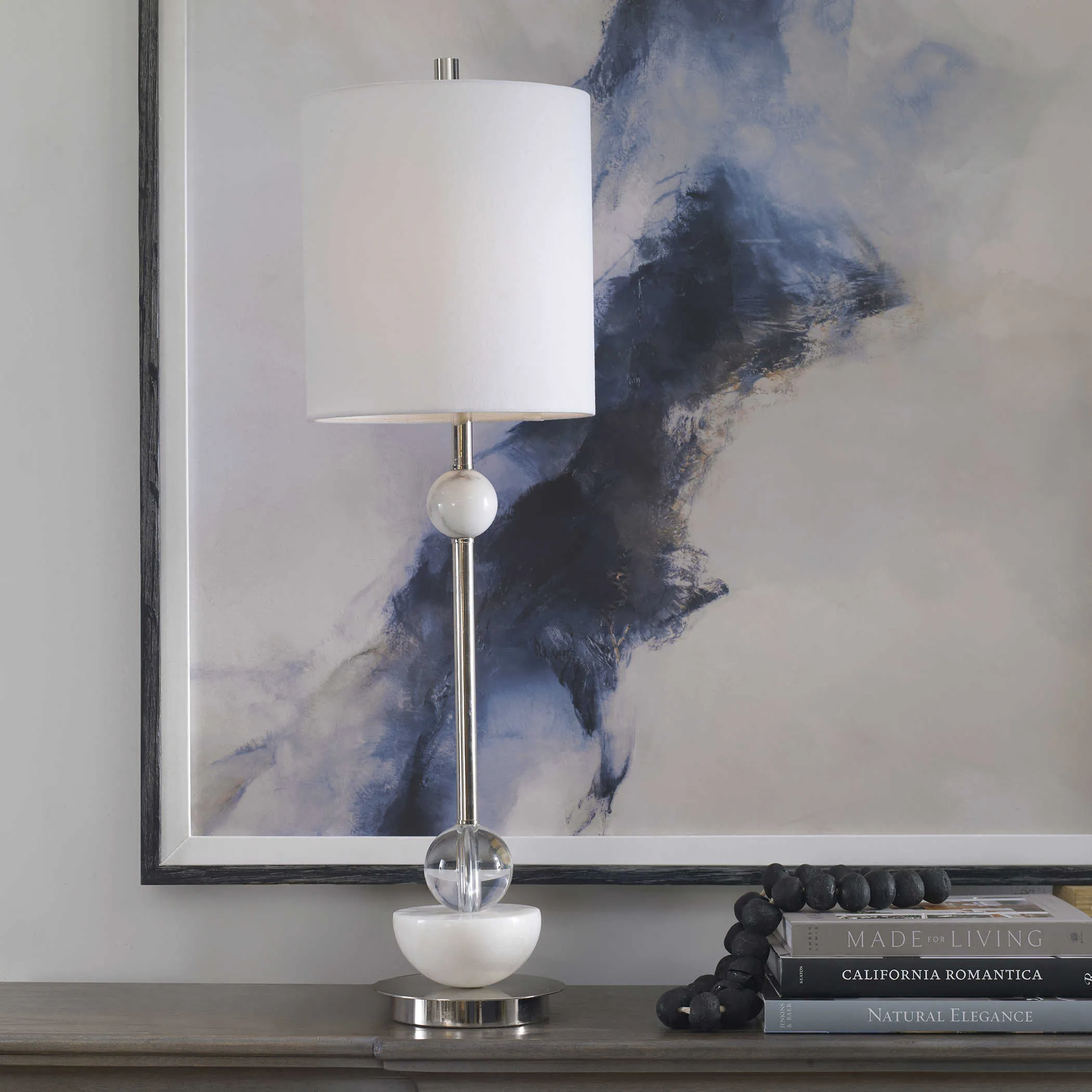 Sleek and refined, this contemporary buffet lamp showcases a streamlined iron base in polished nickel with natural white marble and crystal accents. Paired with a hardback white linen fabric drum shade.