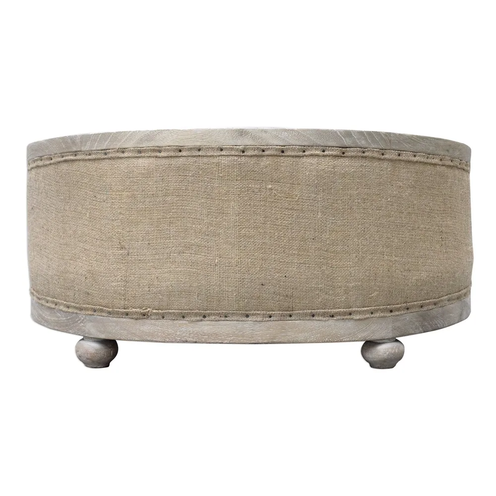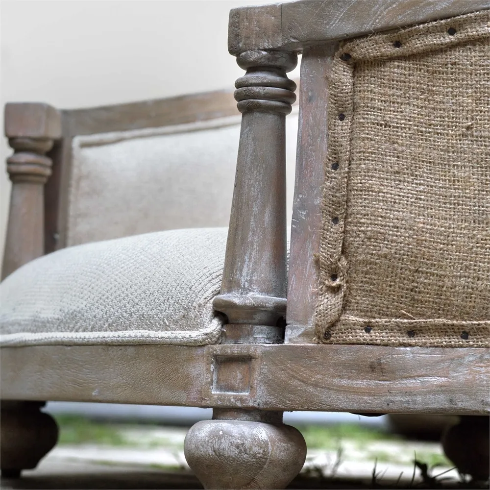 The essence of French country is tastefully exposed in this solid mahogany hardwood frame accented with turned supports, all finished in a weathered oatmeal. Neatly tailored in a soft neutral linen, with a tan burlap exterior trimmed with antique brass traditional upholsterer's tacks. Designer: Billy Moon