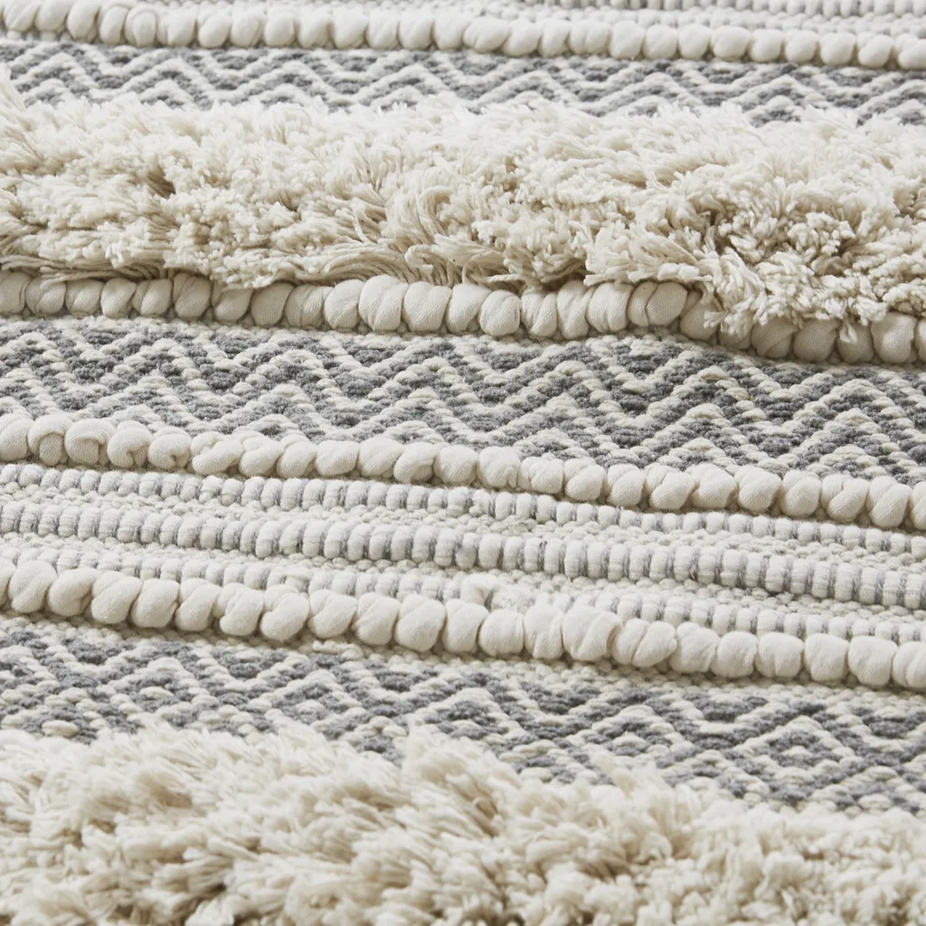 Globally inspired with an artisan touch, the INK+IVY Asher Woven Texture Stripe Bath Rug is the perfect update to refresh your bathroom decor. This hand-woven bath rug features a combination of beautiful patterns, shaggy textures, and fabric techniques in a vertical stripe layout, for a stylish Boho look and feel. The shaggy woven texture is featured in a solid light natural hue, which alternates between a grey geo pattern and fabric manipulation technique to create soft dimension and a unique design. Machine washable for easy care; this rug is also finished with a Non-skid resistance latex backing to help keep the rug in place throughout the day. Complete the look of this New INK+IVY bath rug collection with any of our coordinating INK+IVY Shower Curtain, Bedding, and Window Collections, available and sold separately.