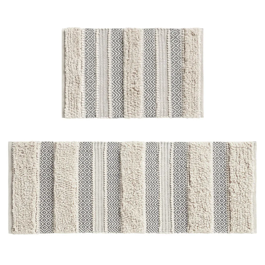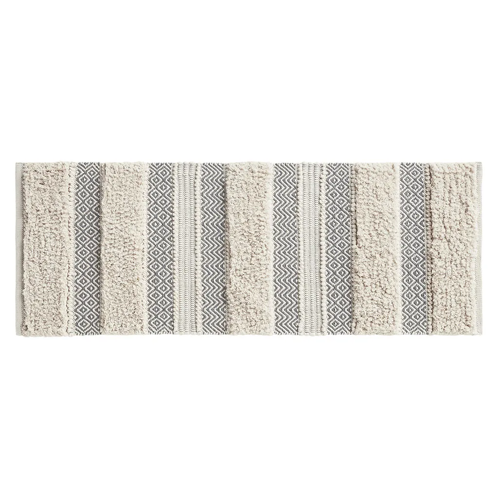 Globally inspired with an artisan touch, the INK+IVY Asher Woven Texture Stripe Bath Rug is the perfect update to refresh your bathroom decor. This hand-woven bath rug features a combination of beautiful patterns, shaggy textures, and fabric techniques in a vertical stripe layout, for a stylish Boho look and feel. The shaggy woven texture is featured in a solid light light natural hue, which alternates between a grey geo pattern and fabric manipulation technique to create soft dimension and a unique design. Machine washable for easy care; this rug is also finished with a Non-skid resistance latex backing to help keep the rug in place throughout the day. Complete the look of this New INK+IVY bath rug collection with any of our coordinating INK+IVY Shower Curtain, Bedding, and Window Collections, available and sold separately.