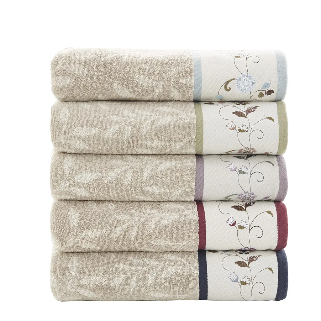 Add a touch of elegance to your bathroom decor with our Madison Park Serene Embroidered Cotton Jacquard 6 Piece Towel Set. These cotton towels feature a jacquard leaf pattern with a floral embroidered hem, and navy contrast piping details to create a beautiful and sophisticated look. This cotton towel set is also OEKO-TEX certified (Made in Green), meaning it does not contain any harmful substances or chemicals, ensuring quality comfort and wellness. Highly absorbent and incredibly soft from its medium weight terry loop construction, this towel set is also machine washable for easy care for the perfect addition to any bathroom. Set includes: 2 standard 27x52" bath towels, 2 standard 16x28" hand towels, and 2 standard 12x18" fingertip towels.