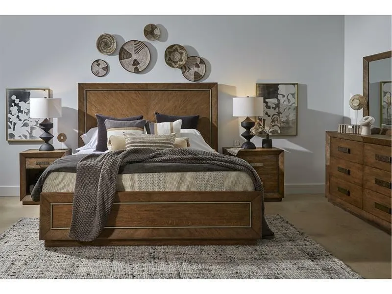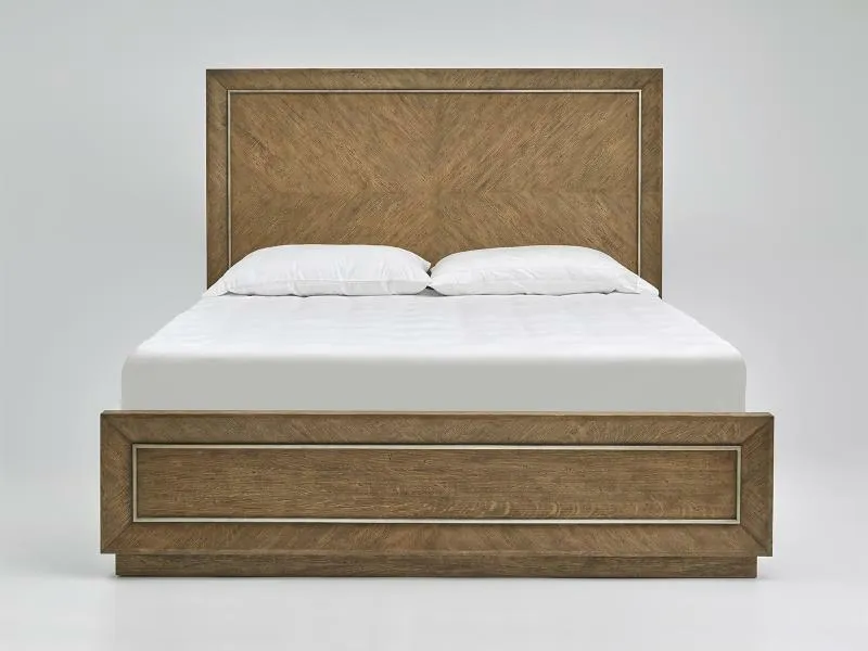 Both rustic and modern are adjectives that were used as we created these pieces. Clean lined cases with beveled, box mitered picture frame details are veneered with a herringbone pattern surrounding each bank of drawers to create subtle detail. Plinth bases are recessed to create a floating effect, rounding out the contemporary lines. This group is veneered with extra thick cut, cathedral white oak with flake for a natural organic vibe. The finish employs significant hand ageing including wirebrushing, rocking, rasp and gouging to create the desired rustic effect. The upholstered beds feature Culp's Omari fabric. Constructed with an offset basket weave, this fabric consists of a polyester, rayon, and linen yarn blend. The plied slub yarns are used in both the warp and weft direction to create a subtle color contrast and add overall texture.
