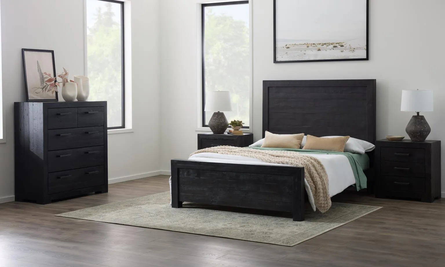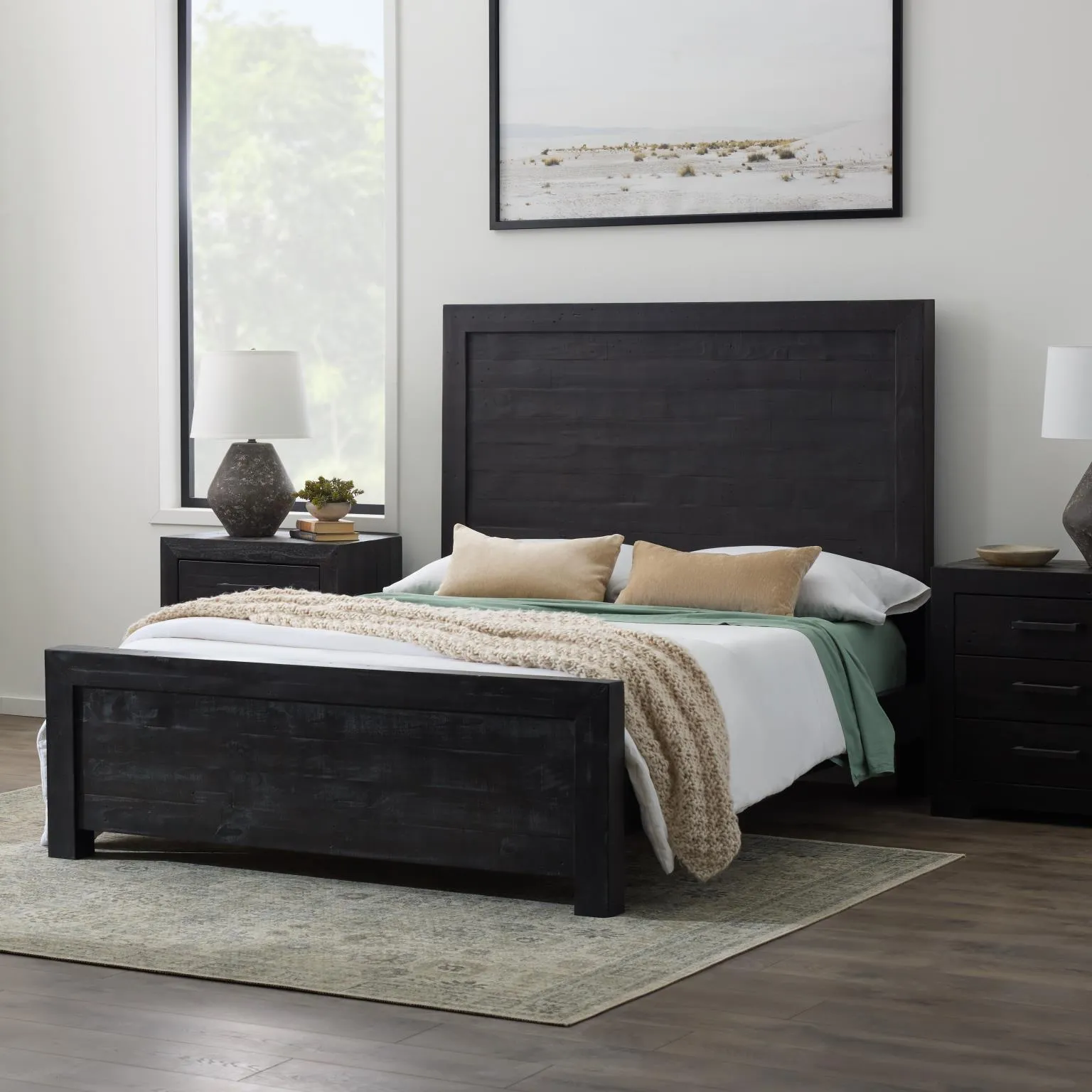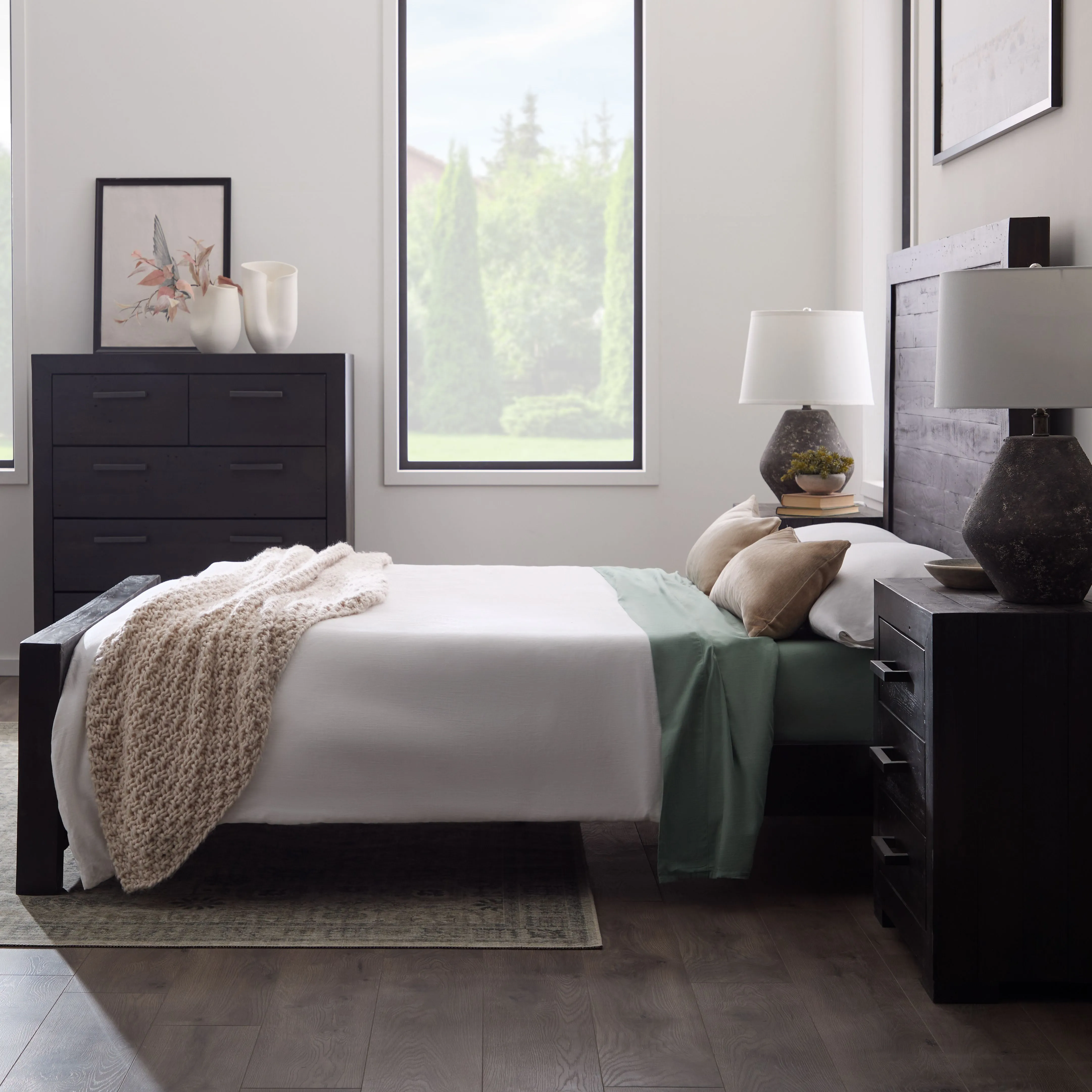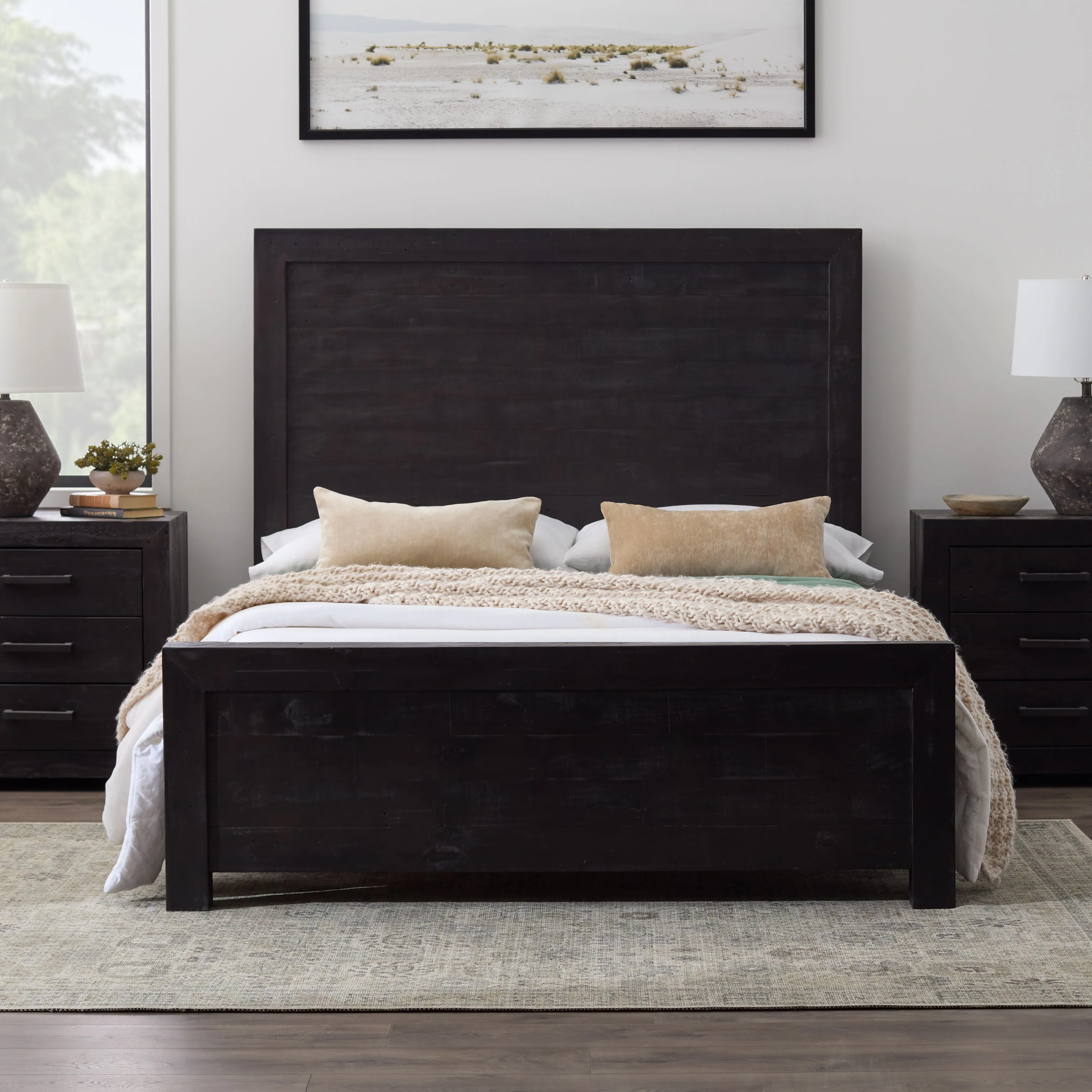 A striking focal point in the bedroom thanks to dark-stained wood and a tall, dramatic headboard.