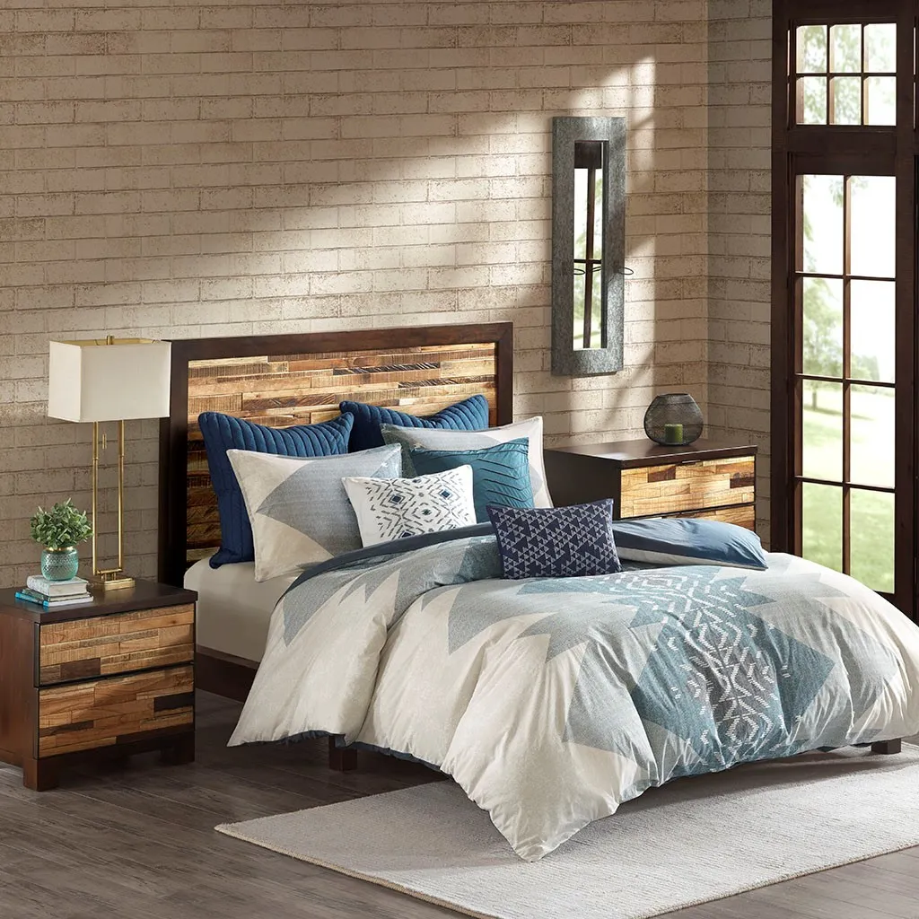 The INK+IVY Nova 3 Piece Comforter Mini Set blends a modern flair with a boho design to revitalize your bedroom. This cotton comforter showcases globally-inspired geometric prints down the center that create dimension and add depth. A solid blue reverse complements the top of the bed, while hidden bartacking secures the filling and creates a clean duvet-like finish. The 2 coordinating shams bring this comforter set together and complete the one-of-a-kind look. This cotton comforter set is OEKO-TEX certified, meaning it does not contain any harmful substances or chemicals, and uses an antimicrobial treatment that provides built-in freshness protection, reducing the growth of odor causing bacteria to keep fabric lasting longer. Euro shams and decorative pillows are sold separately.
