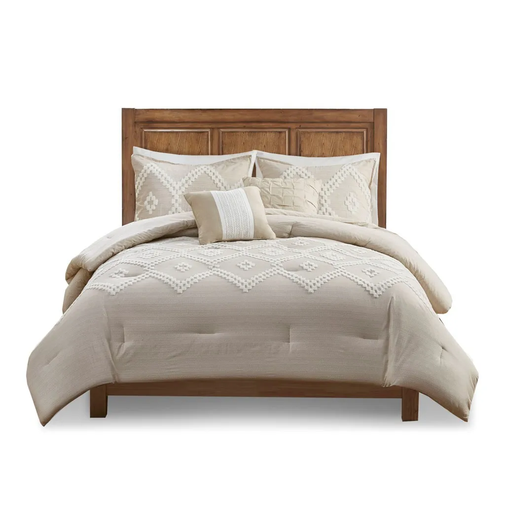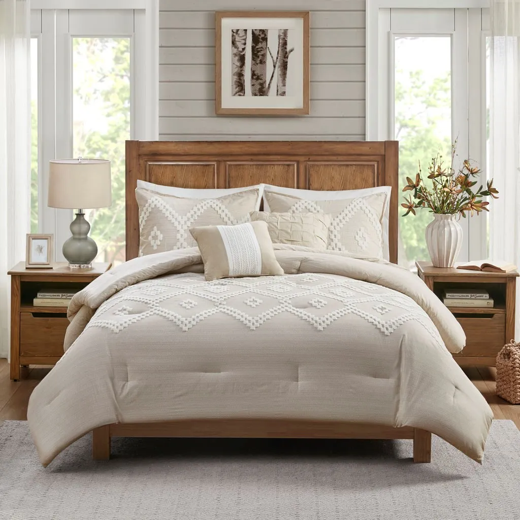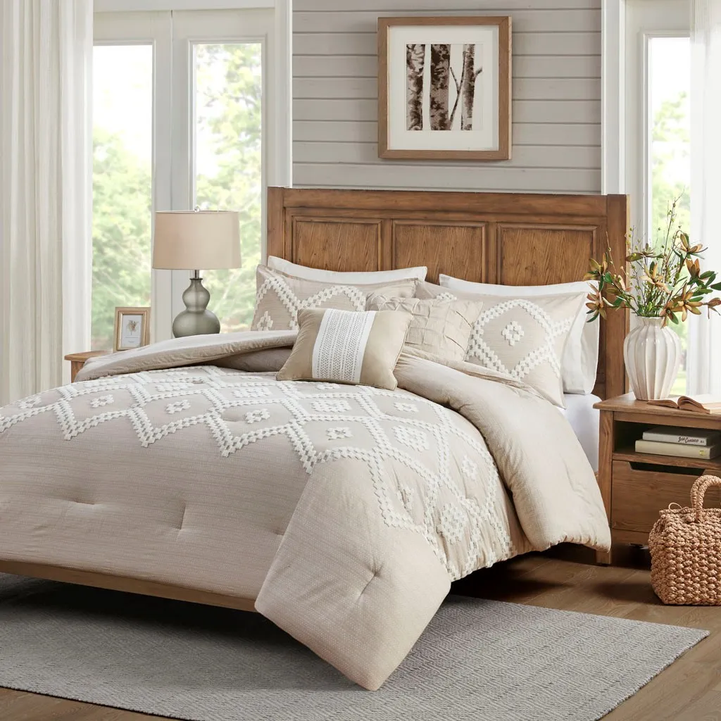 The Madison Park Teague 5 Piece Cotton Comforter Set offers a simple and warm update to your bedroom decor. This taupe comforter is made from 100% cotton and features a tufted geometric chenille design that adds dimension to the top of the bed. The 2 matching shams also flaunt tufted chenille patterns that mirror the comforter. Also included are 2 decorative pillows that provide the finishing touches to this farmhouse bedding set. Machine washable for easy care, this cotton comforter set creates a warm and inviting charm in your bedroom.