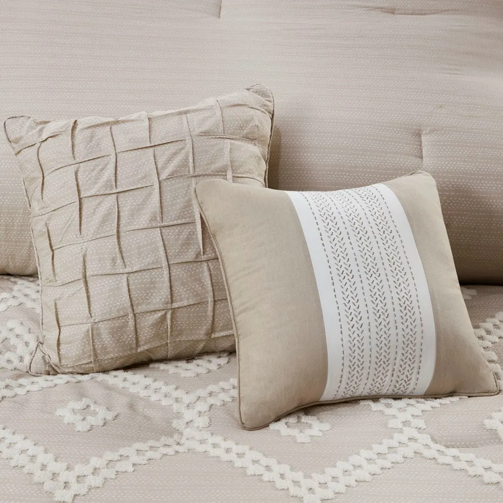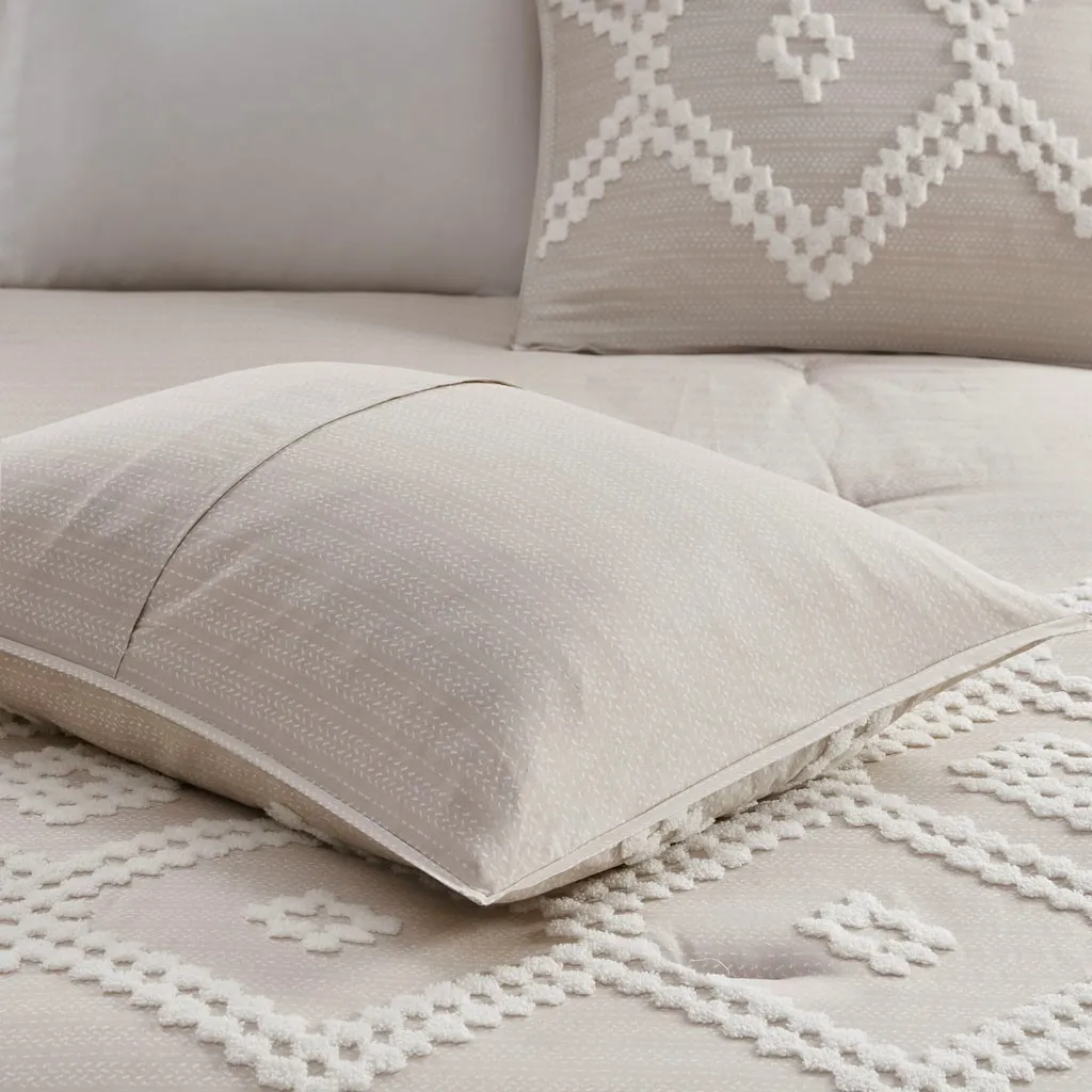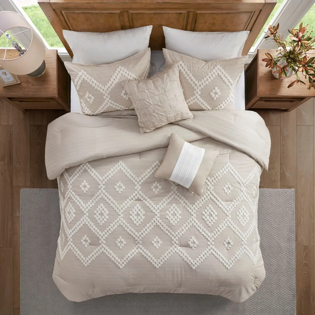 The Madison Park Teague 5 Piece Cotton Comforter Set offers a simple and warm update to your bedroom decor. This taupe comforter is made from 100% cotton and features a tufted geometric chenille design that adds dimension to the top of the bed. The 2 matching shams also flaunt tufted chenille patterns that mirror the comforter. Also included are 2 decorative pillows that provide the finishing touches to this farmhouse bedding set. Machine washable for easy care, this cotton comforter set creates a warm and inviting charm in your bedroom.